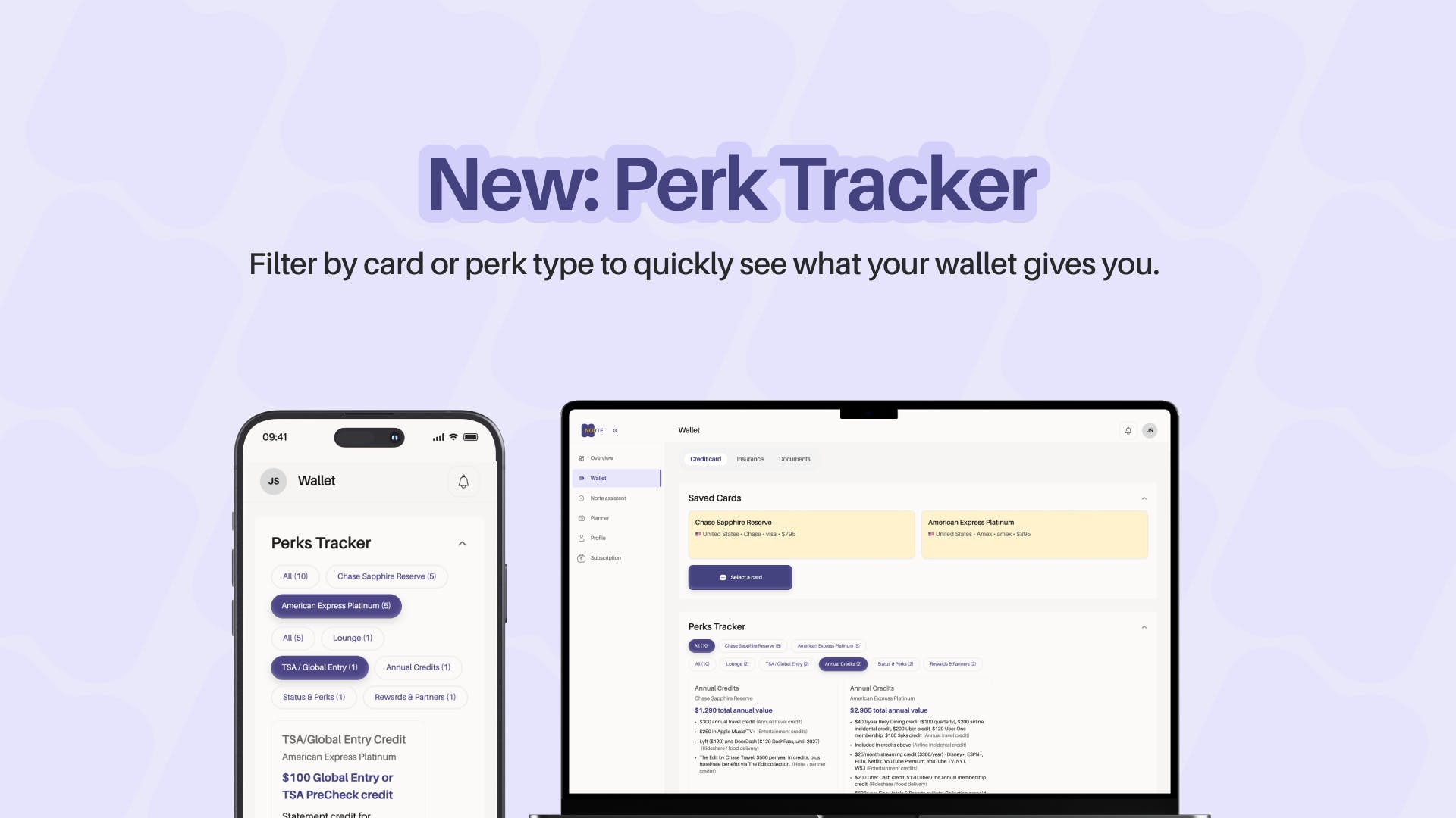 Your wallet now has a clearer “Perks Tracker” — filter by card or perk type (lounge, credits, TSA, rewards…) and instantly see what’s available.
