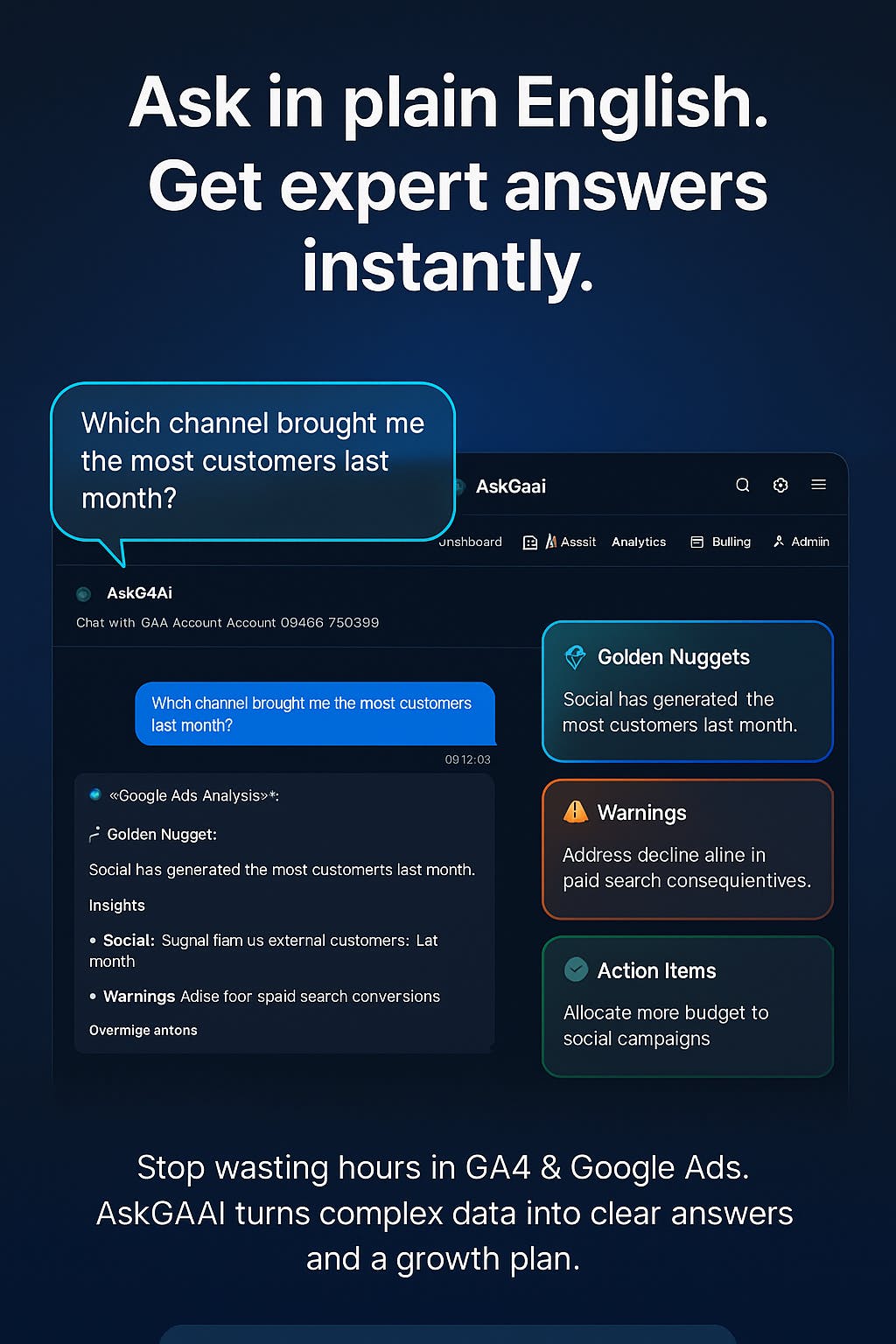 Just connect your GA4 and Ads accounts, ask questions in plain English, and get an executive summary with growth tips, golden nuggets, and action items — instantly.