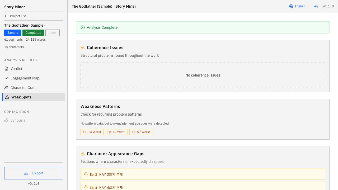 - Weak Spots — Coherence issues, low-engagement episodes, character gaps