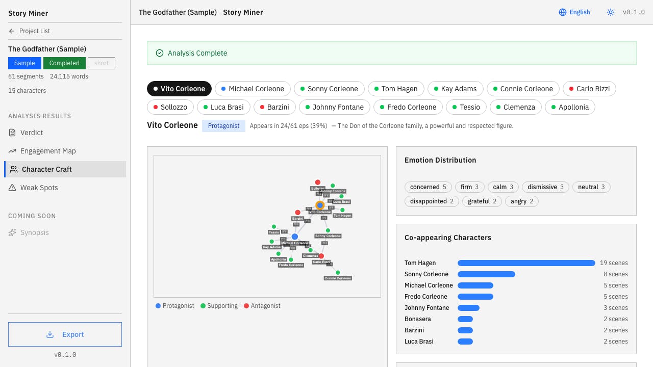 Try it: novelcat.io — pre-analyzed The Godfather screenplay sample, no signup needed.