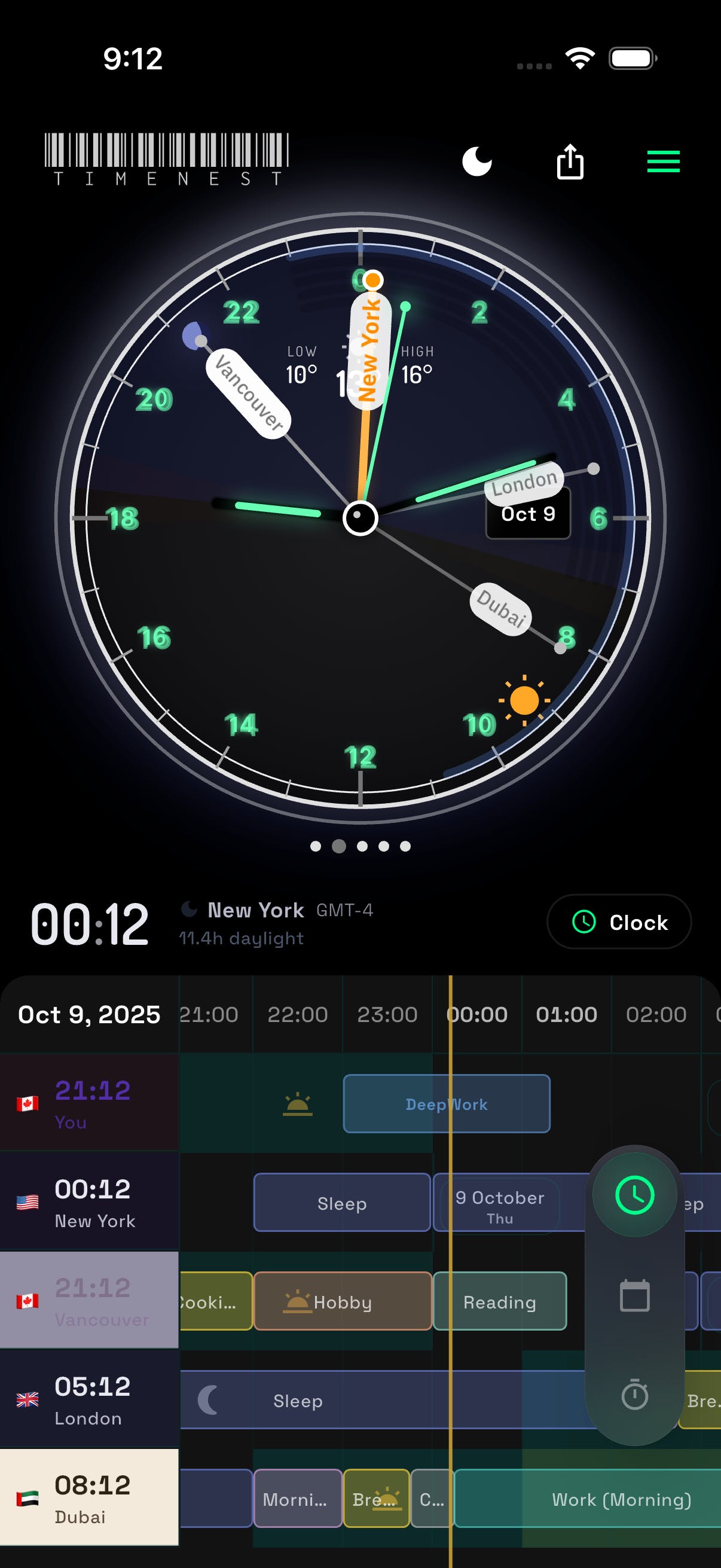 β’ Analog clock view for intuitive multi-timezone visualization π