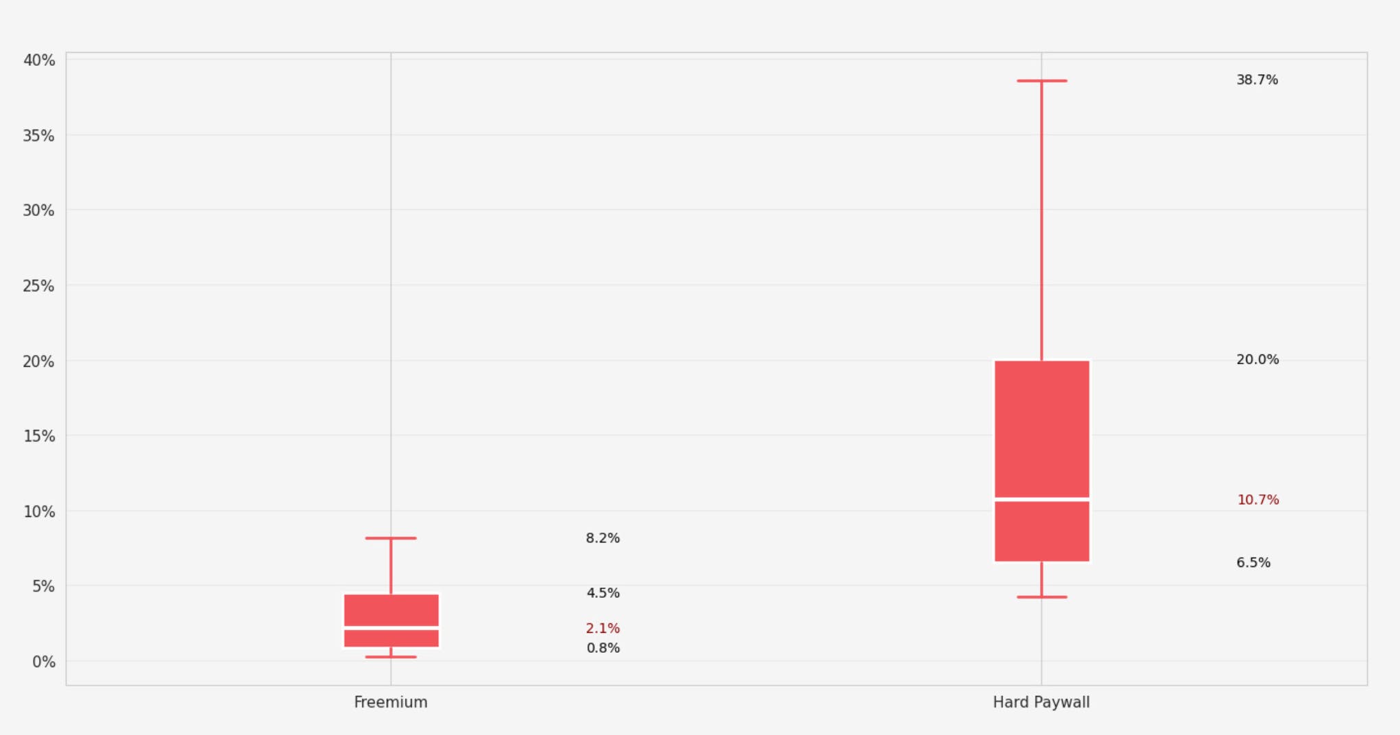 Across the population of apps they analyzed, apps classified as hard paywall tended to show much higher early paid conversion than apps classified as freemium. That’s an observational comparison, not a randomized experiment.