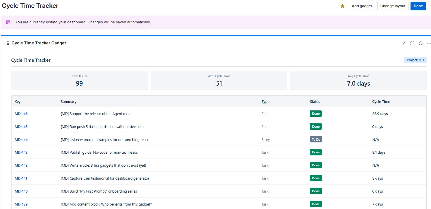 “Create a ‘Cycle Time Tracker’ dashboard gadget. Add a dropdown to select a project. For the selected project, show a summary with total issues, number of issues with cycle time, and average cycle time in days. Below, list all issues in a table with columns: key, summary, issue type, status, cycle time from ‘In Progress’ to ‘Done.’”