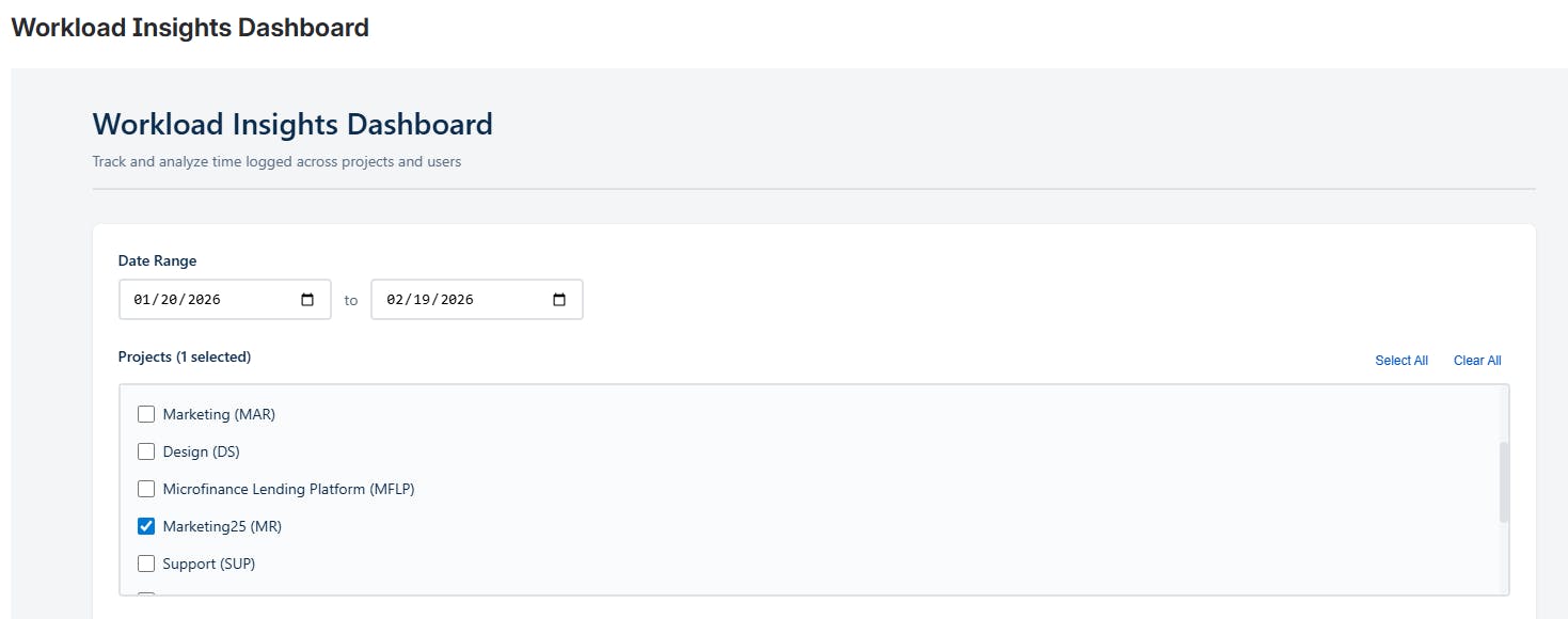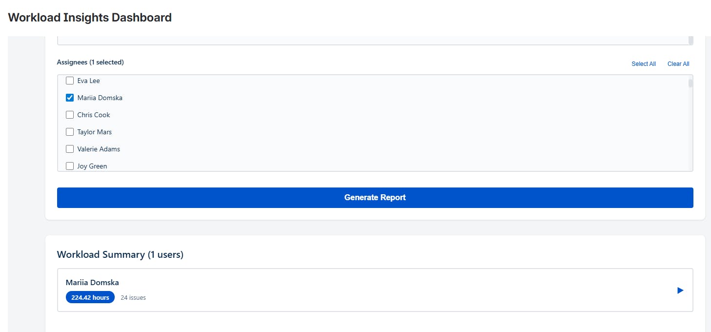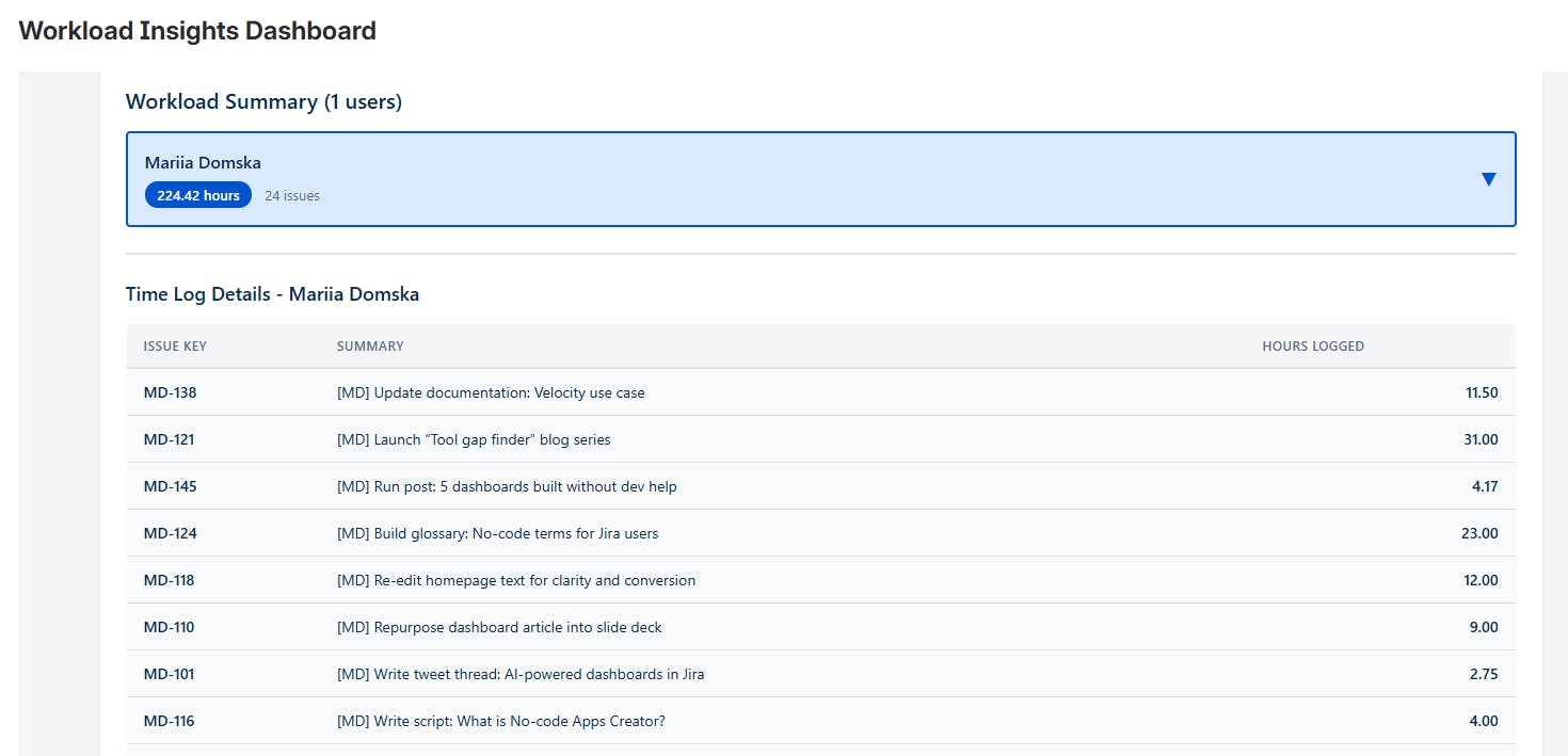 “Create a ‘Workload Usage’ dashboard gadget that shows total hours logged per user within a selected date range. Add multi-select filters for project and assignee, and show only users who logged time in the selected period. When I click a user, open a table with issue key, summary, and hours logged for each issue.”