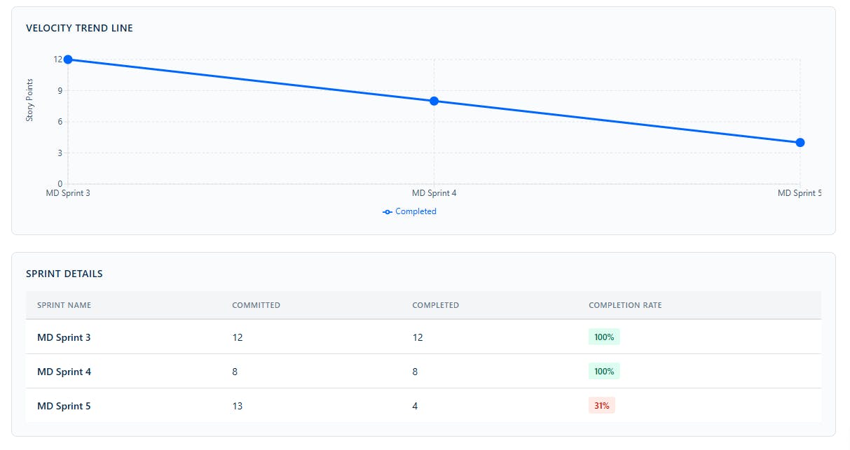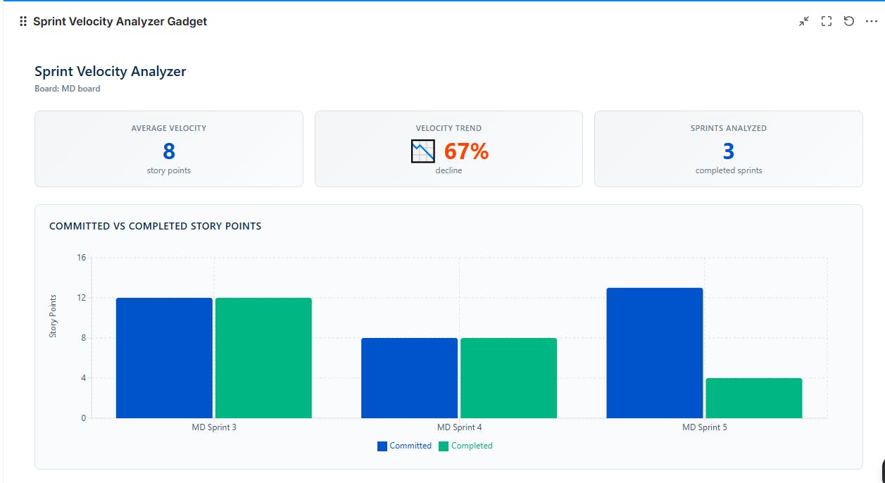 “Build a dashboard gadget to analyze our team’s performance across sprints. Show a velocity trend chart for the last 3 sprints, plotting story points committed versus completed in each sprint. Calculate and display the average velocity over this period, and include a trend line or percentage change to highlight improvements or declines.”