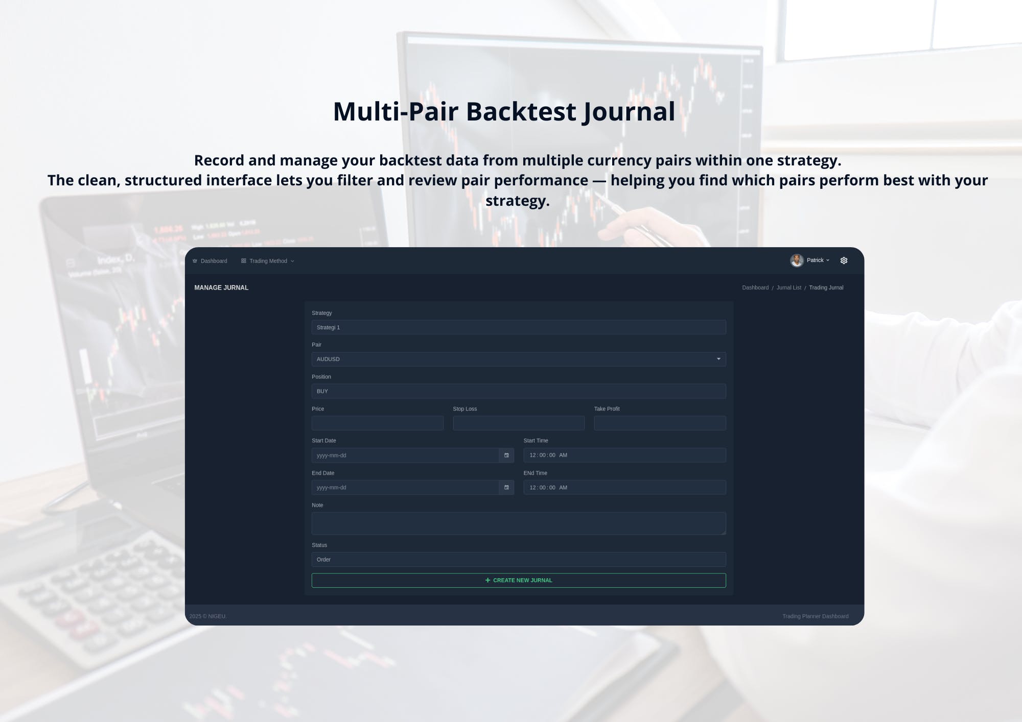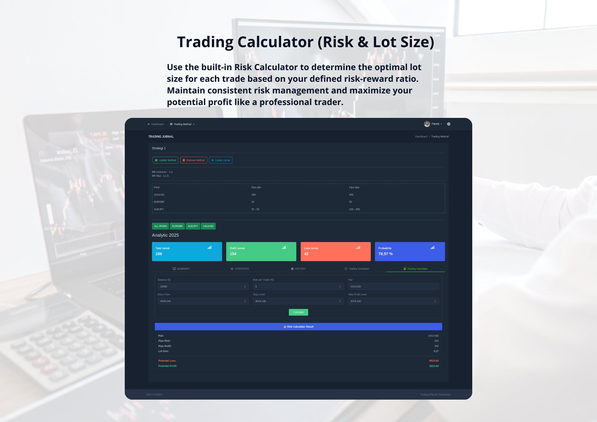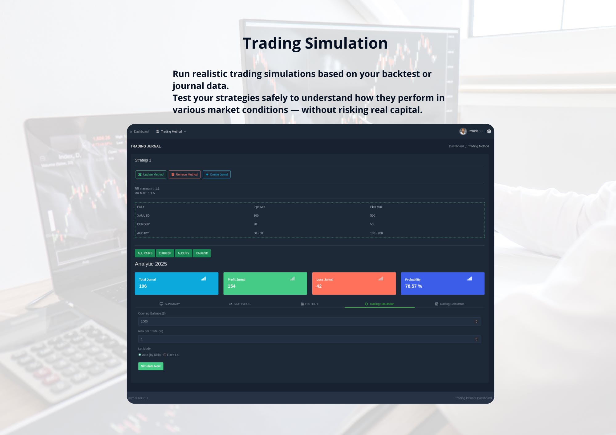 This system allows you to record backtests, manage journals for multiple pairs, view detailed analytics, run trading simulations, and calculate ideal lot sizes based on risk-reward ratio.