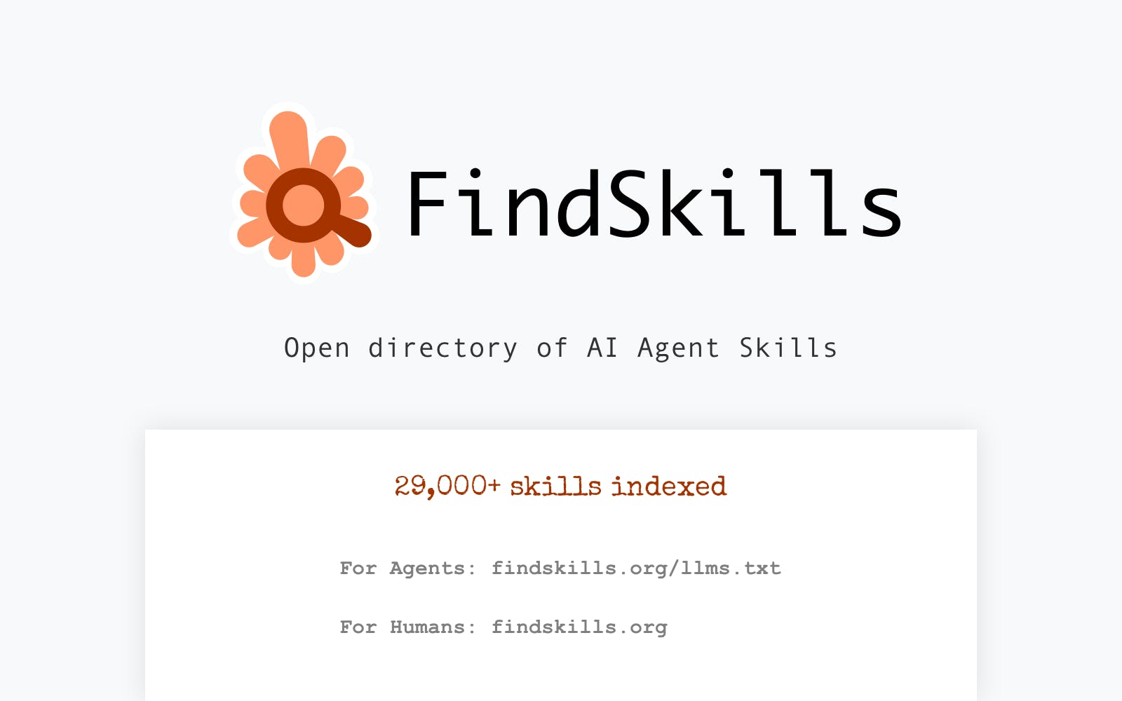 Built for agents first, humans second. Most directories are made for humans to browse. FindSkills is designed so that AI agents can programmatically discover and evaluate skills on their own. Humans get a nice UI too, of course.