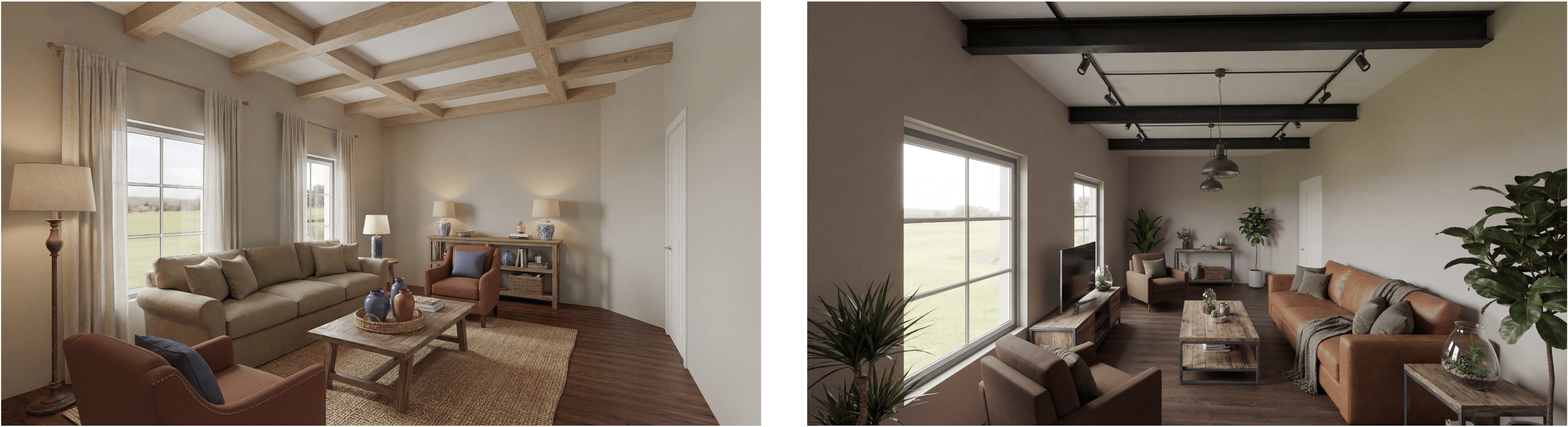 You bring 2D floor plans. We bring AI visualization and AI 3D visualization that understands rooms, openings, and flow. On top of that shell, we layer AI interior design and AI interior décor.