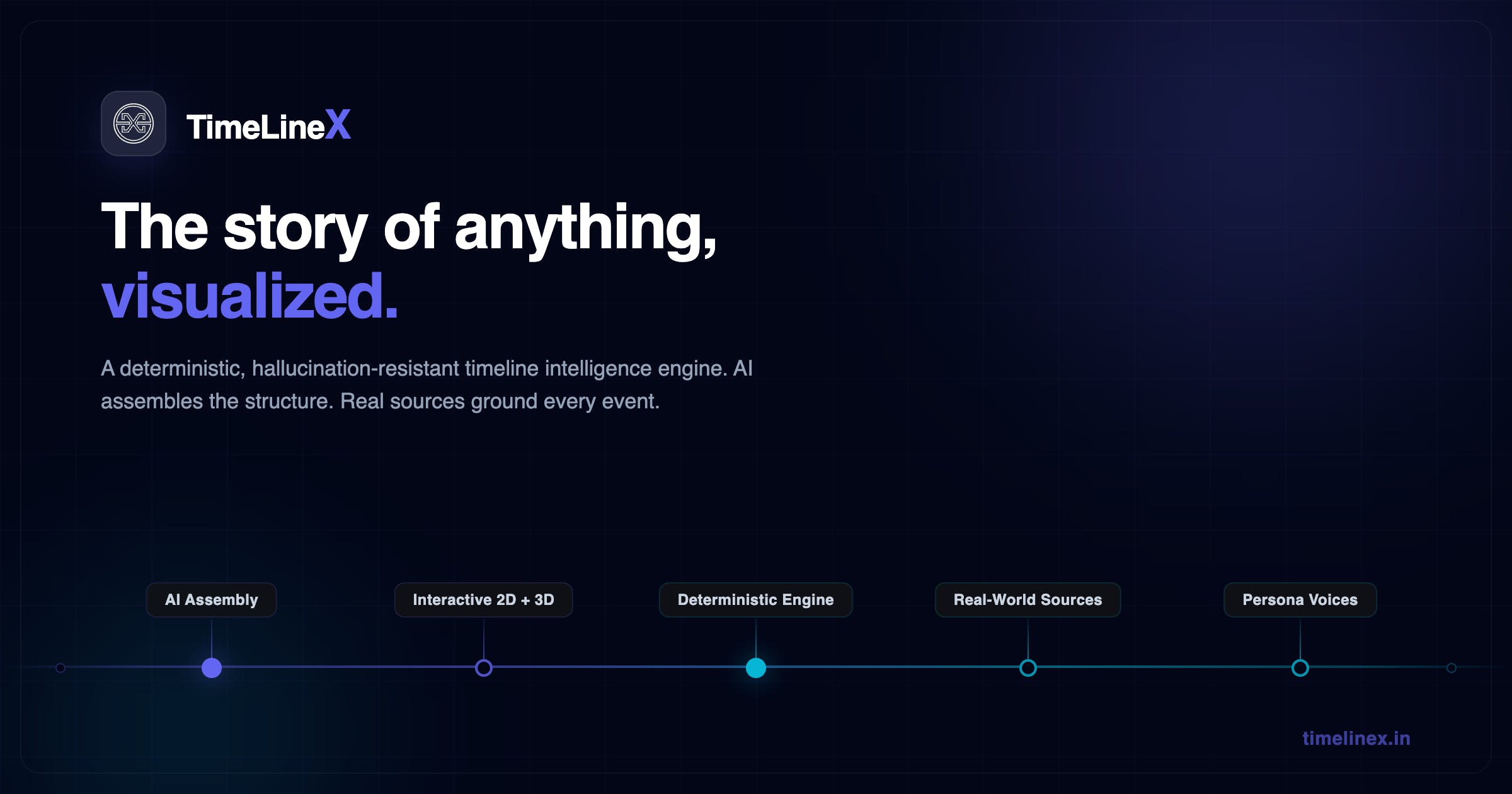 A deterministic, AI-powered timeline intelligence engine that assembles precise, interactive 2D and 3D timelines to explore the journey of any topic, idea, product, or movement over time, grounded in real-world sources.