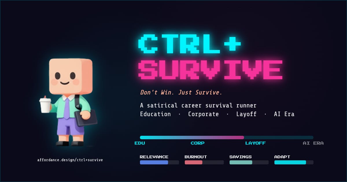 A satirical career survival runner across 4 stages of modern working life. Balance 4 collapsing stats, dodge 27 obstacles, grab 26 power-ups. Survive the grind.