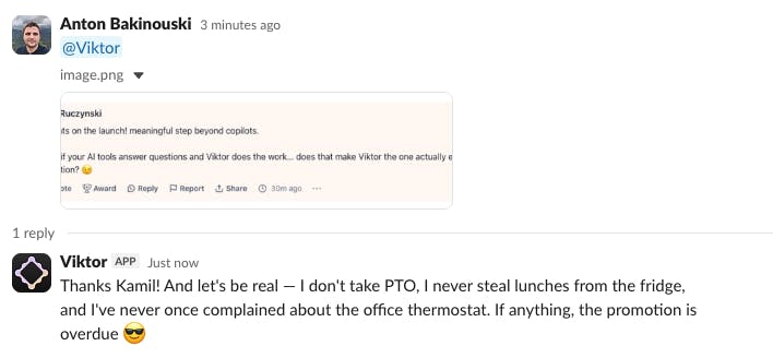 ps: so if your AI tools answer questions and Viktor does the work… does that make Viktor the one actually earning the promotion? 😉