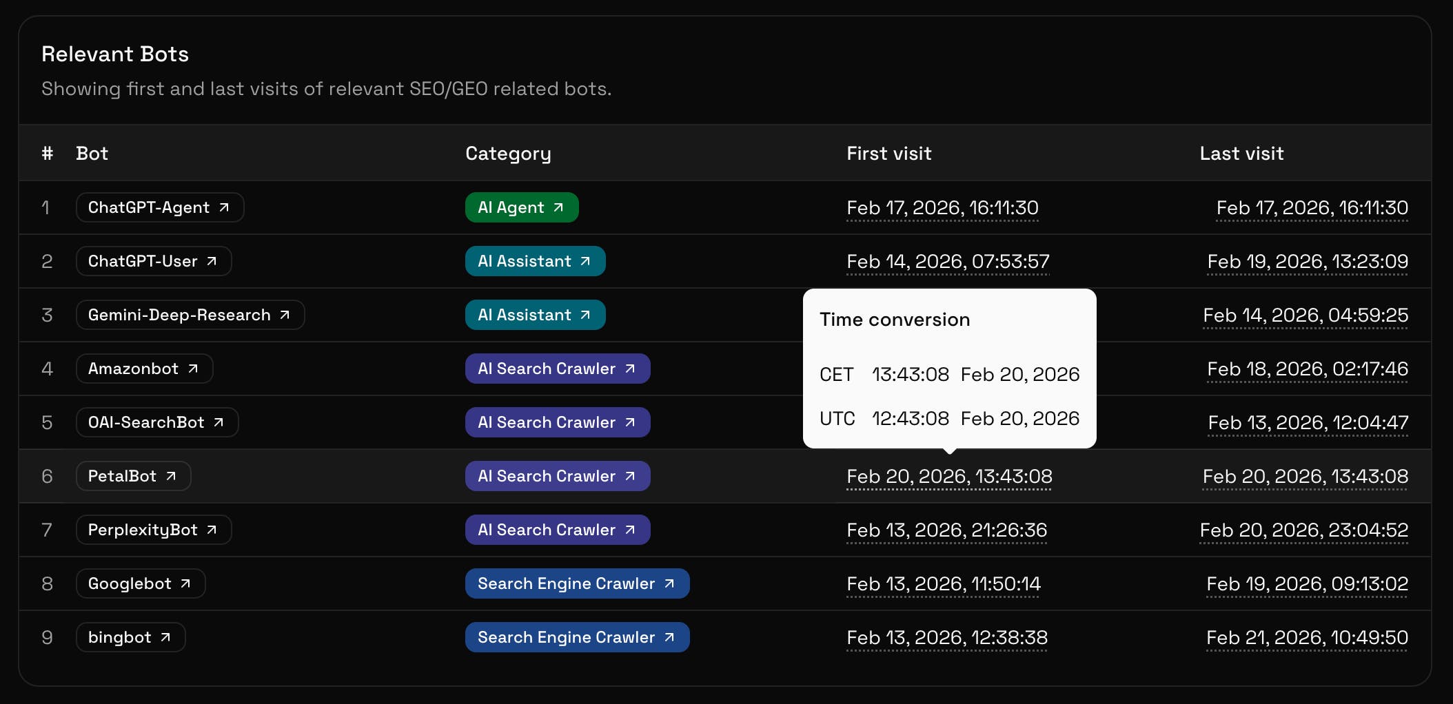 Agent Monitor captures and classifies AI & bot traffic using server-side data. Across 94M+ visits on 249 sites, 65% of traffic was bots - 24% AI bots like ChatGPT, Gemini, and Claude. None of this appears in GA4. We use transparent server-side signals to classify every visit. Get bot profiles, per-bot rankings, AI assistant traffic, and global benchmarks. Built by an SEO agency that needed real data.