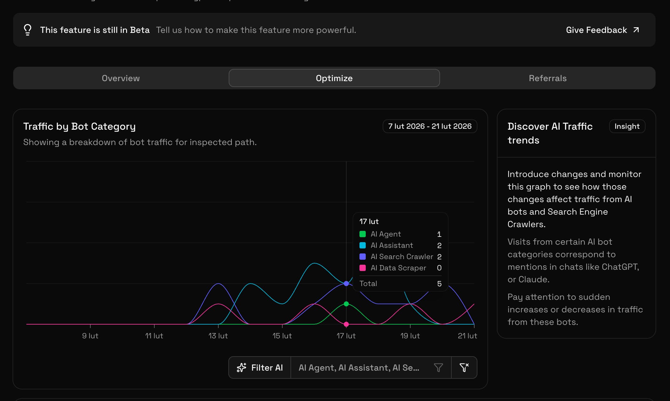 We actually have a URL Inspector feature that shows all kinds of data at the URL level. In the attached screenshots you can see known AI-related bot traffic grouped by their category for a specific page on a website. Below that section we also provide data about when specific bots first discovered your page and when was the last time they visited!