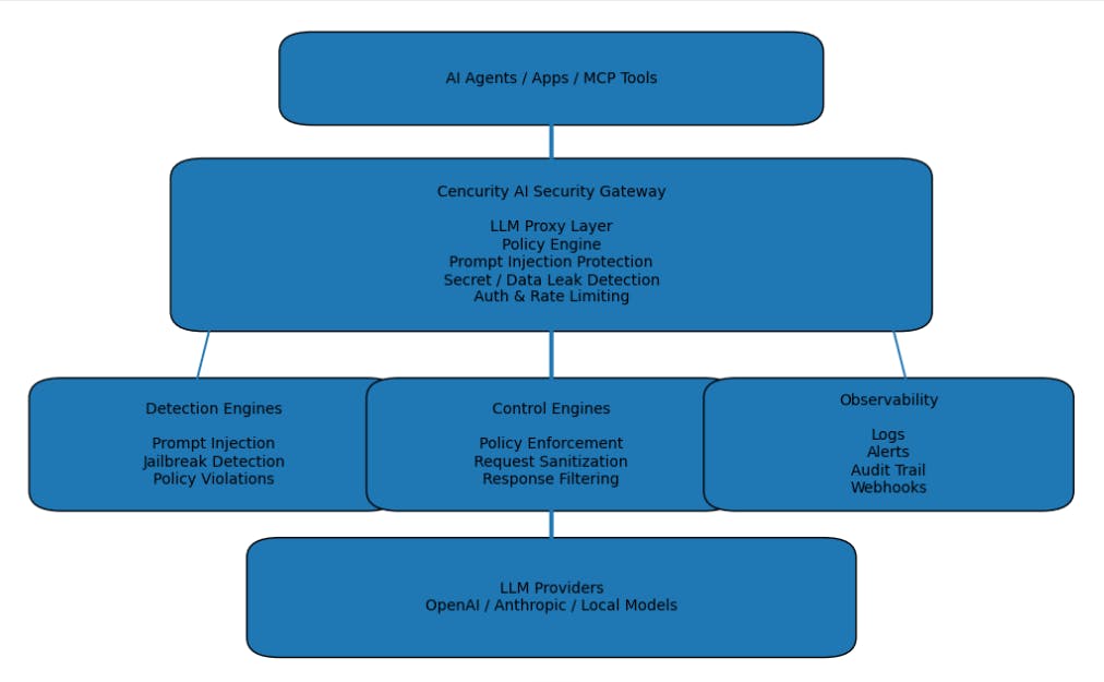 This isn’t about prompting an LLM to review code or training a security-aware model. Cencurity operates at the infrastructure layer — it sits as a proxy between IDE/agent and the upstream LLM provider.