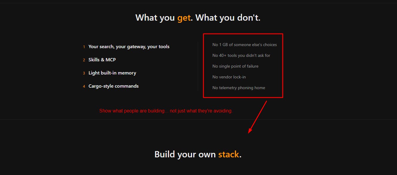 Your homepage says βOther apps decide what your agent should be.β Then it lists features like your search, your gateway, your tools, Skills & MCP, light memory, and Cargo-style commands.