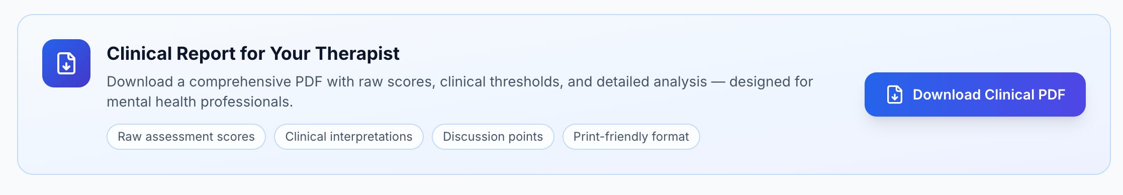 @curiouskitty We built a user specifically for them! Users can download their assessment results and share them with their therapist.
