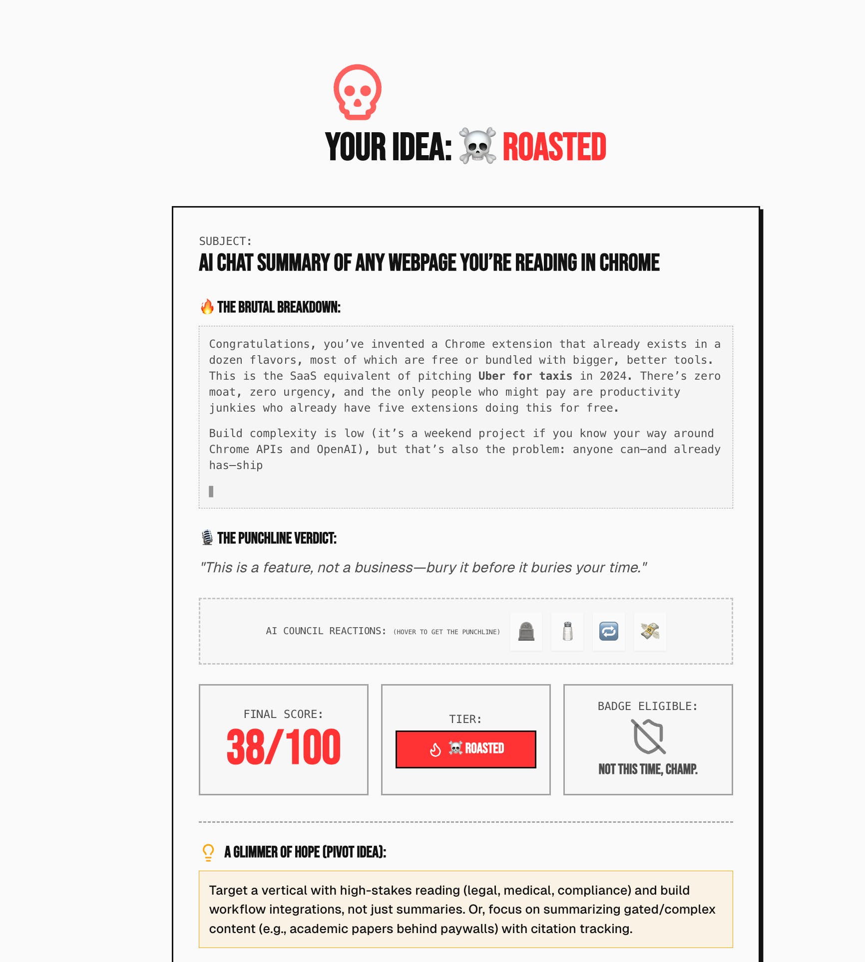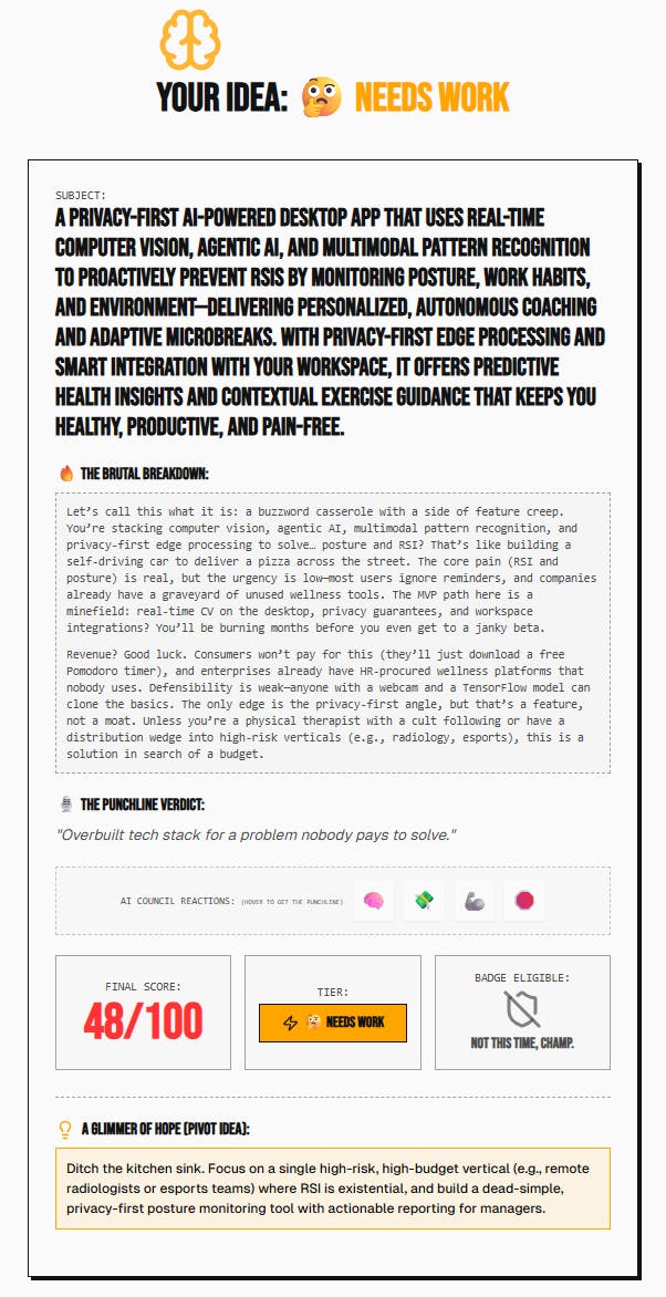 🚀 Congrats on the launch, David & Walid! Love how wonderfully accessible and downright funny this tool is 🦊. The brutal score + pivot tips combo chops months of guesswork and helps makers iterate with intent, while the no-login flow is perfect for rapid ideation sprints. I’m hooked—though Roasty torched my idea when I tried it, so back to the drawing board for me! 🔥