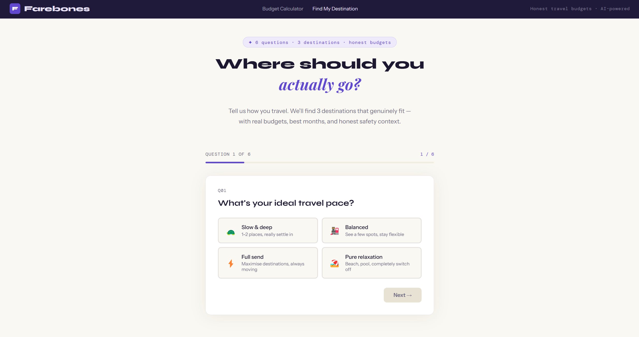 New: Travel Destination Quiz ā 6 questions about how you travel (pace, budget, climate, interests, who you're with, dealbreakers) ā 3 personalised destination matches with honest budgets, best months, and vibe tags.