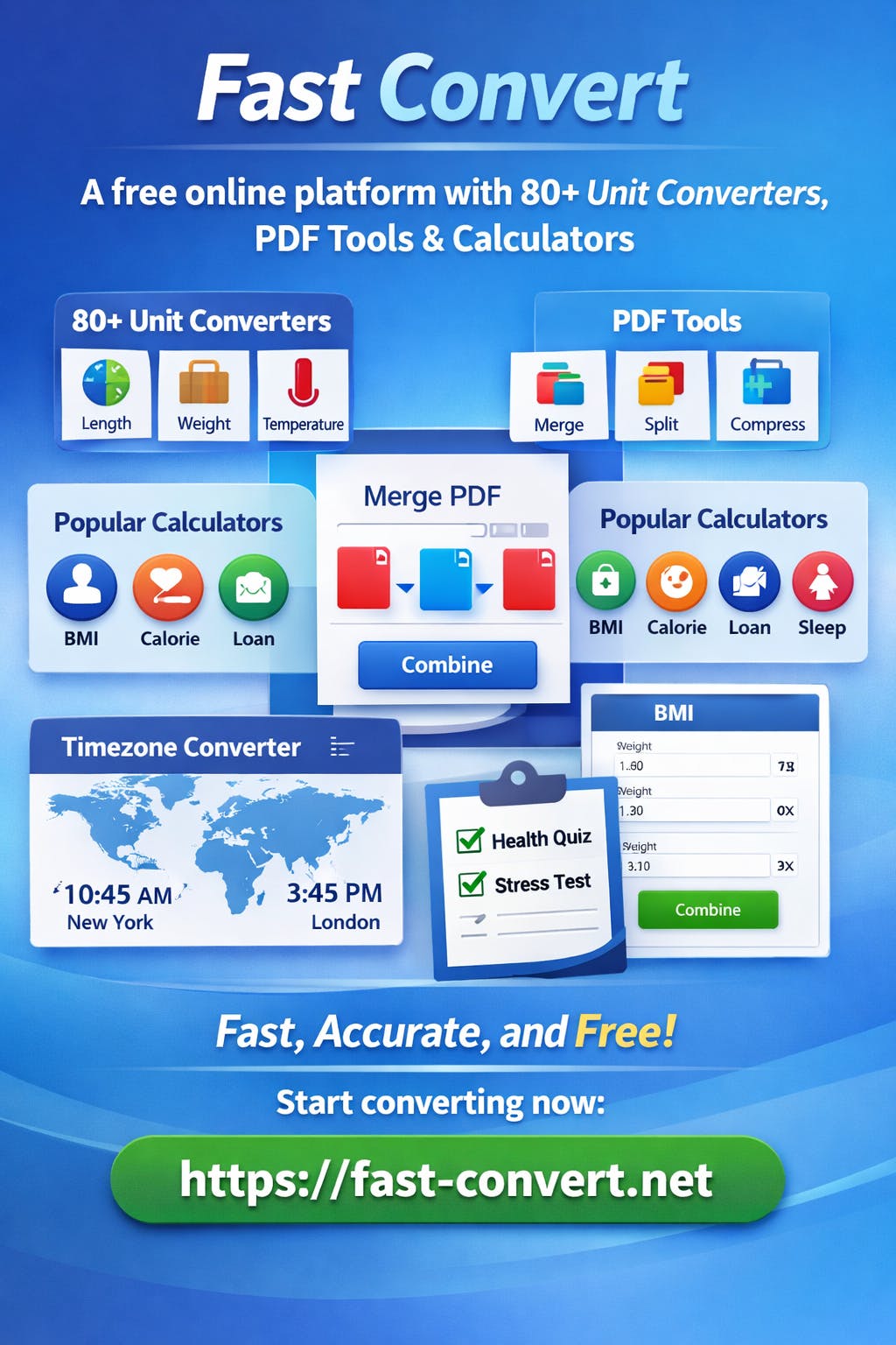 FastConvert is a free online platform with 80+ unit converters, 11 calculators (BMI, calorie, loan, sleep, pregnancy), PDF tools (merge, split, compress), timezone converter, and wellness quiz. Fast, accurate, and free.
