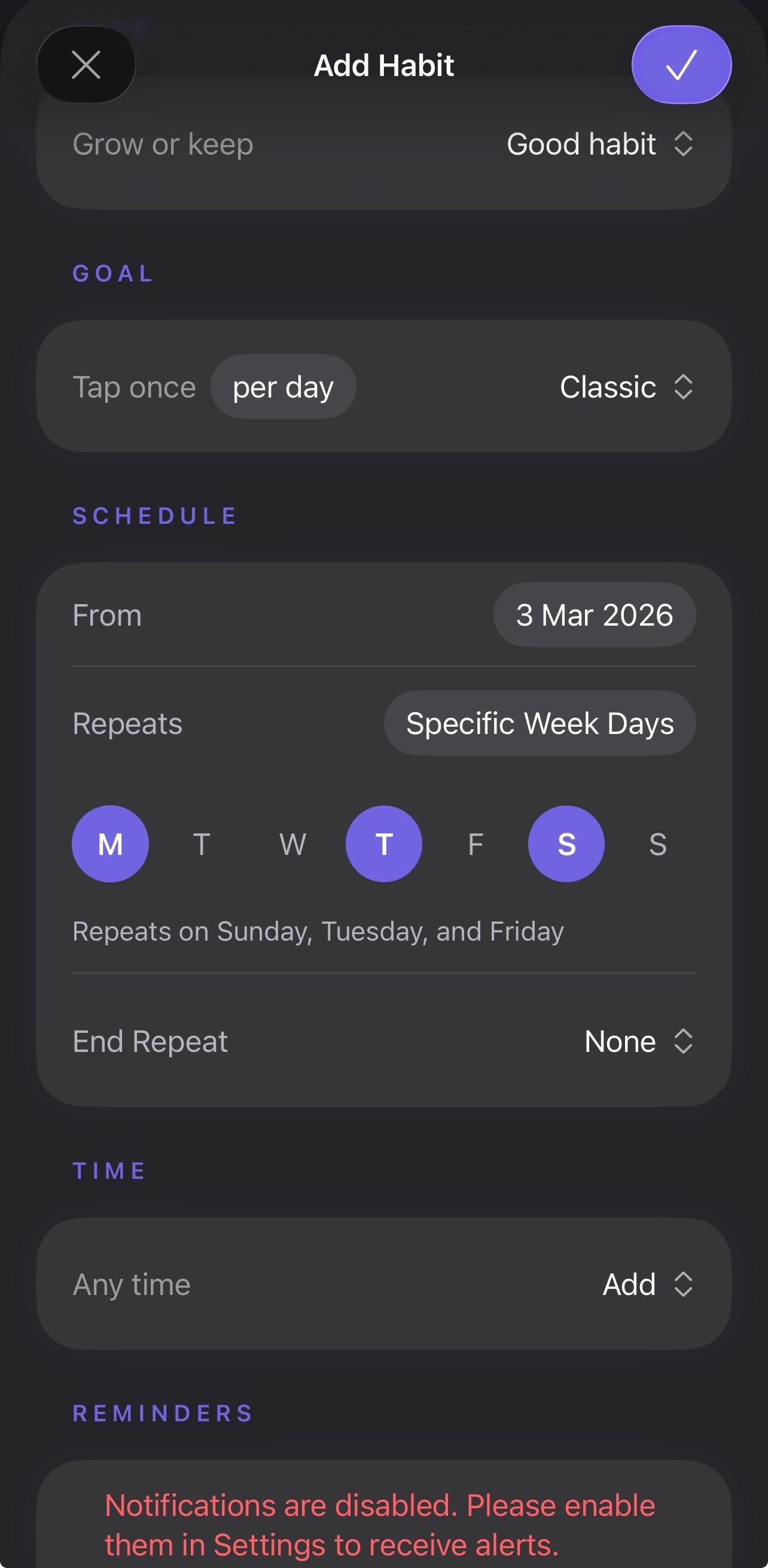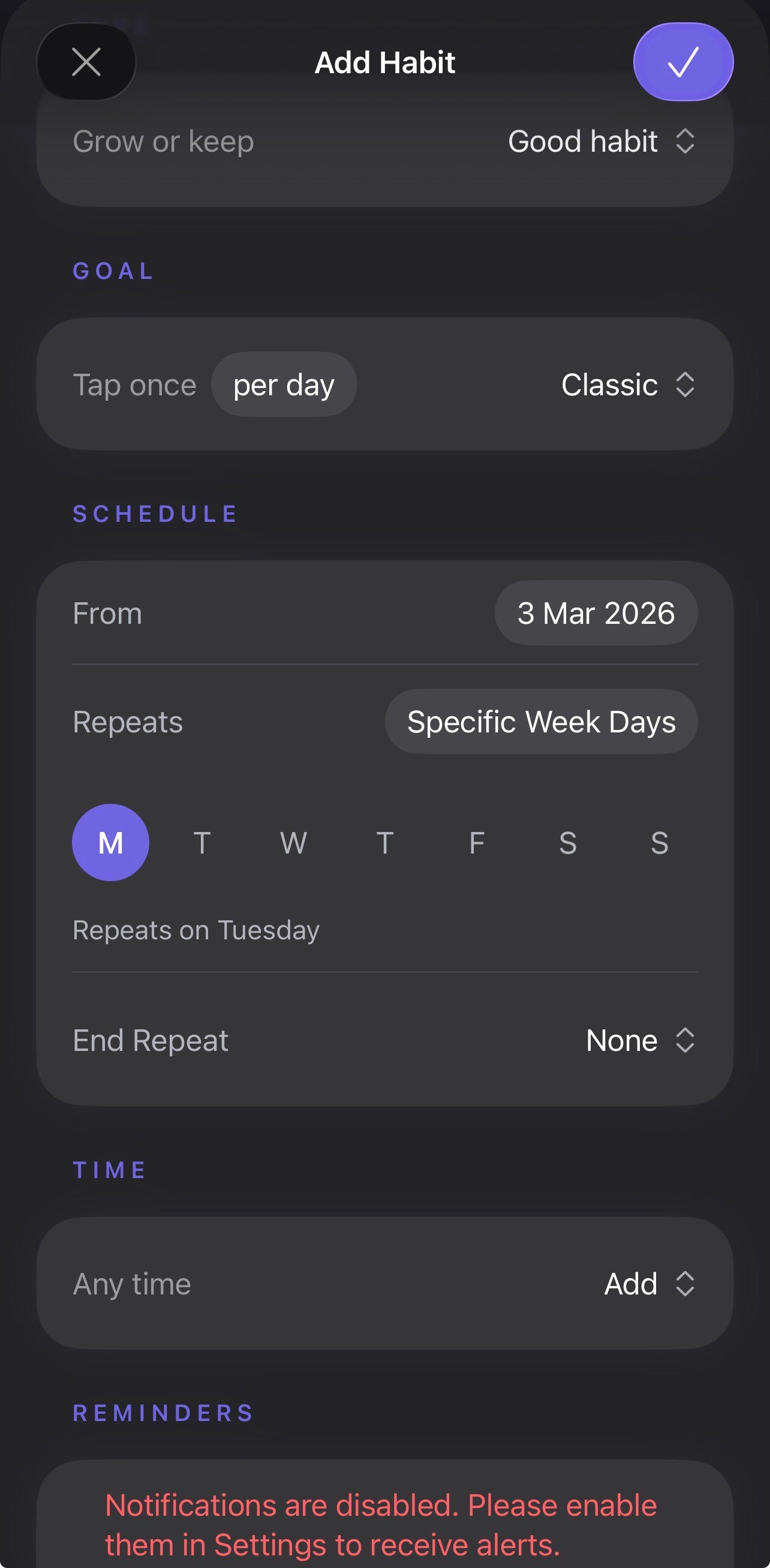 Really impressed by the clarity and execution of this app. The onboarding flow is smooth and well thought out, especially how it adapts based on how you plan to use it. The integration with the calendar feels natural, and the habit-linking mechanism is intuitive without being overwhelming.
