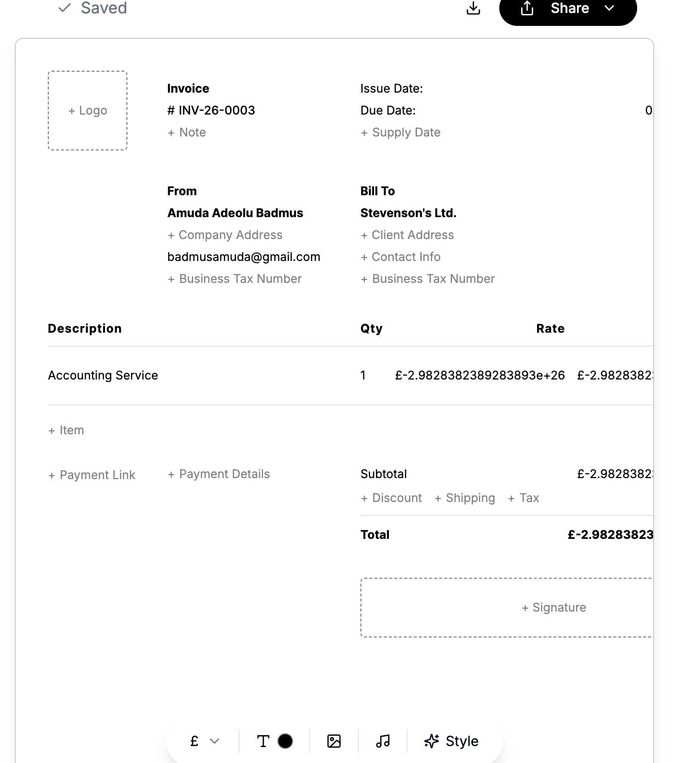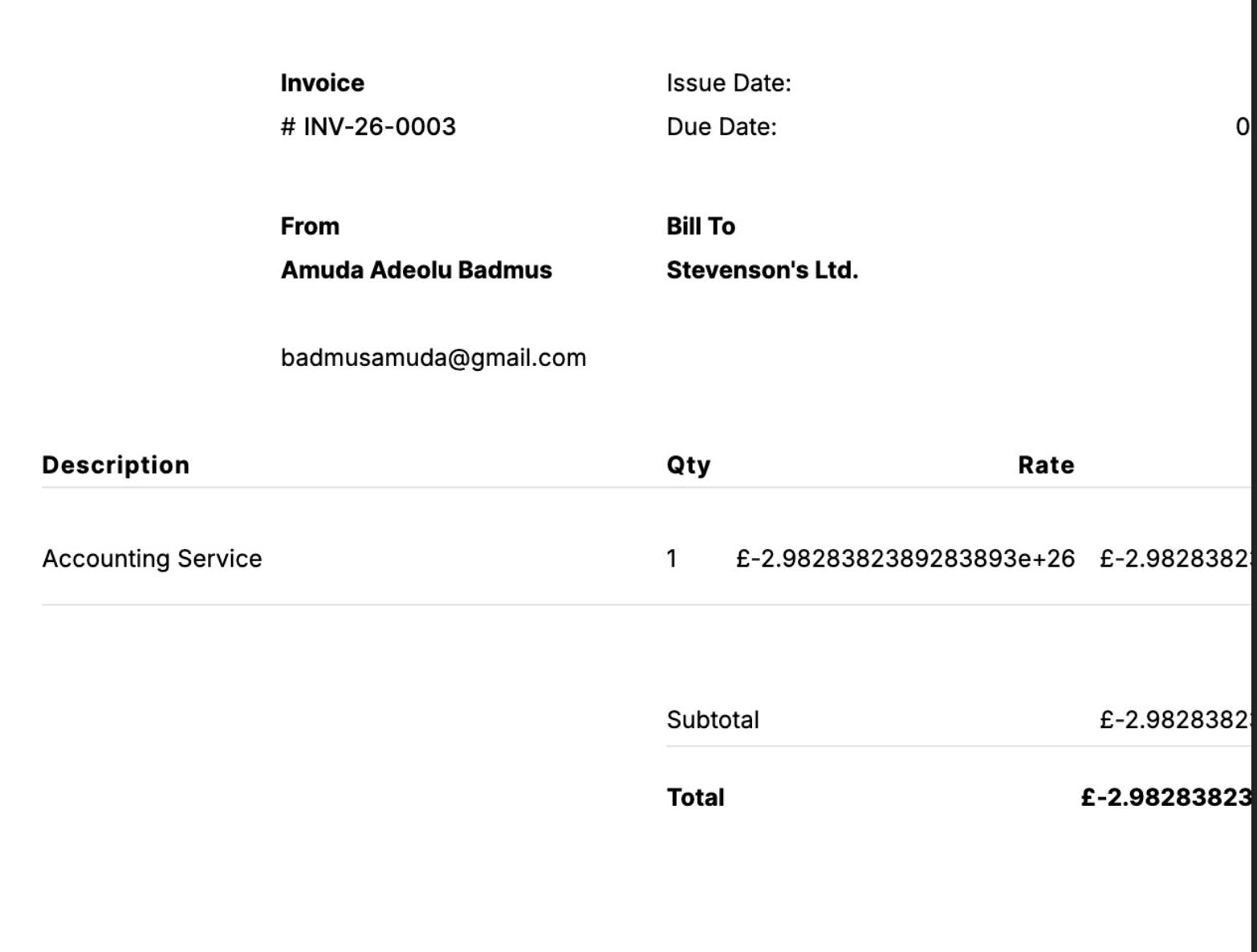 "Create an invoice for Stevenson's Ltd. £-298283823892838923899283250 for Accounting Service, due in -191991829827 days"
