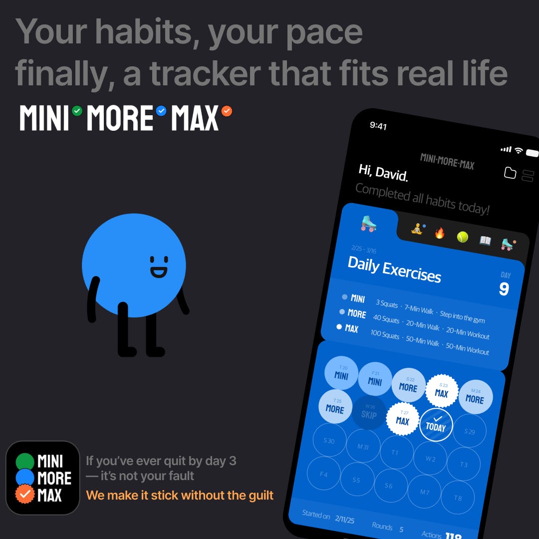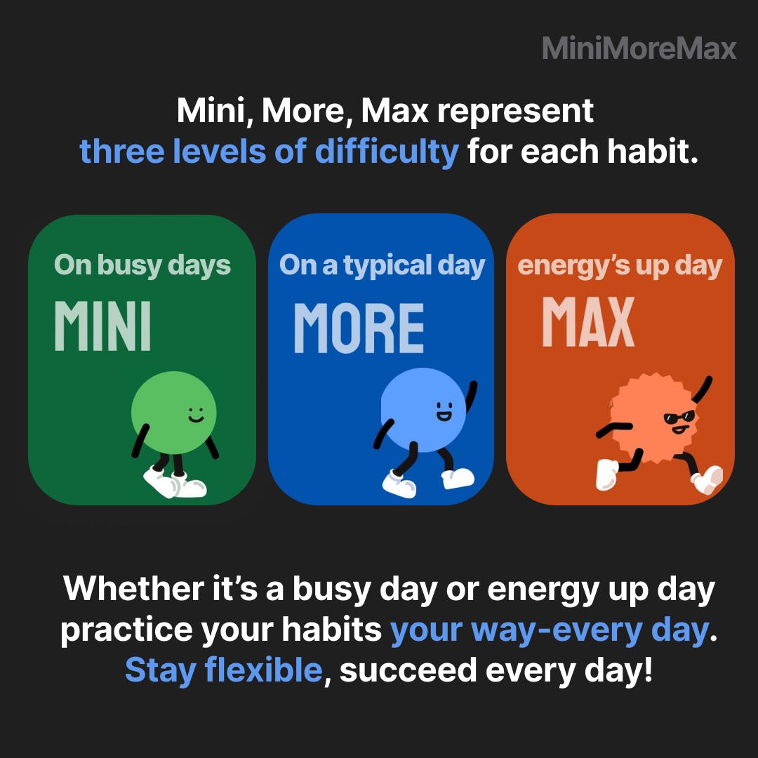 MiniMoreMax helps you build sustainable habits — one day, one goal, at your pace. Choose from MINI, MORE, or MAX levels and track only what matters. Less pressure, more progress. A flexible, minimalist habit tracker made for real people.