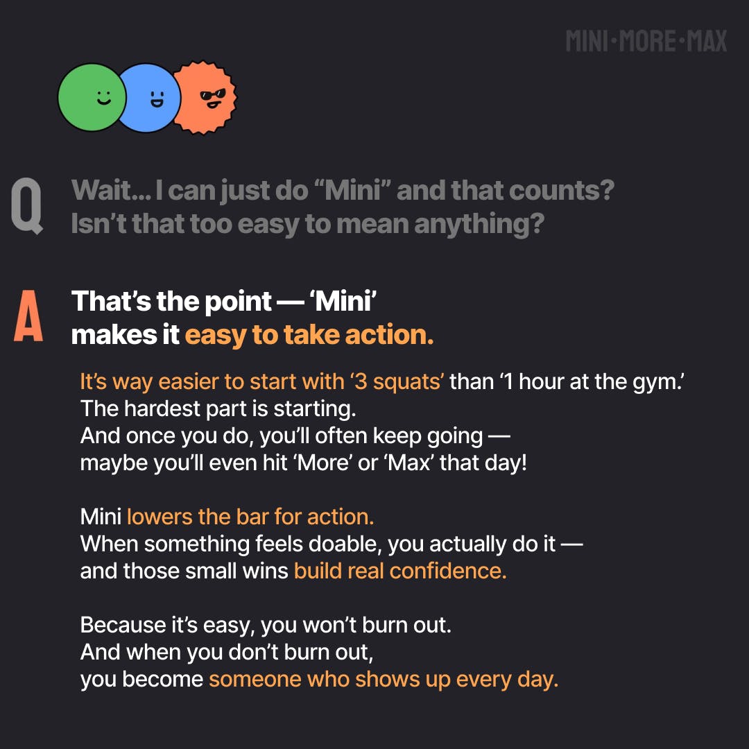 The tiered goal system (MINI/MORE/MAX) reflects smart behavioral design - balancing structure with flexibility. The minimalist tracking approach likely uses lightweight data models that reduce user friction while maintaining meaningful progress insights.