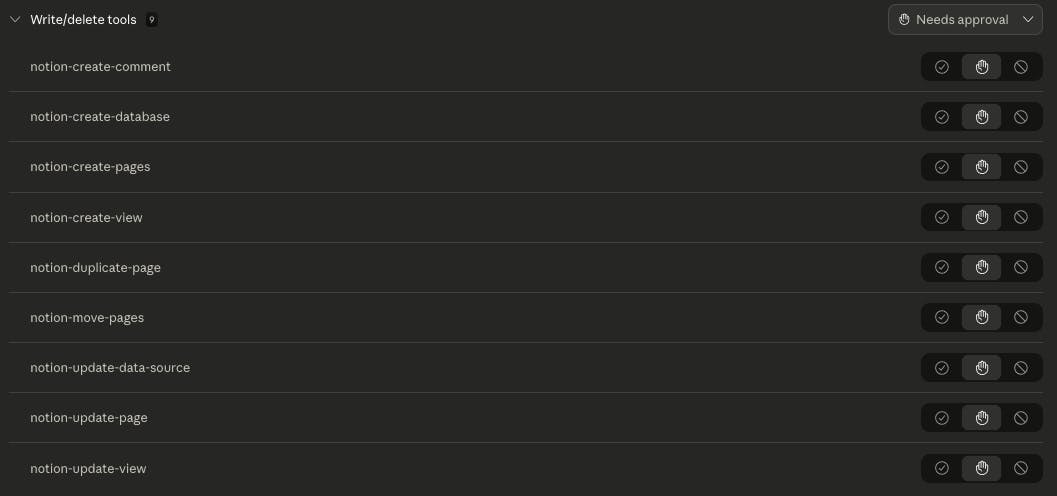 Good news: For Claude connector with Notion, it seems they now have the following write/delete permissions that one can set to always approve, rather than requiring approval from the user.