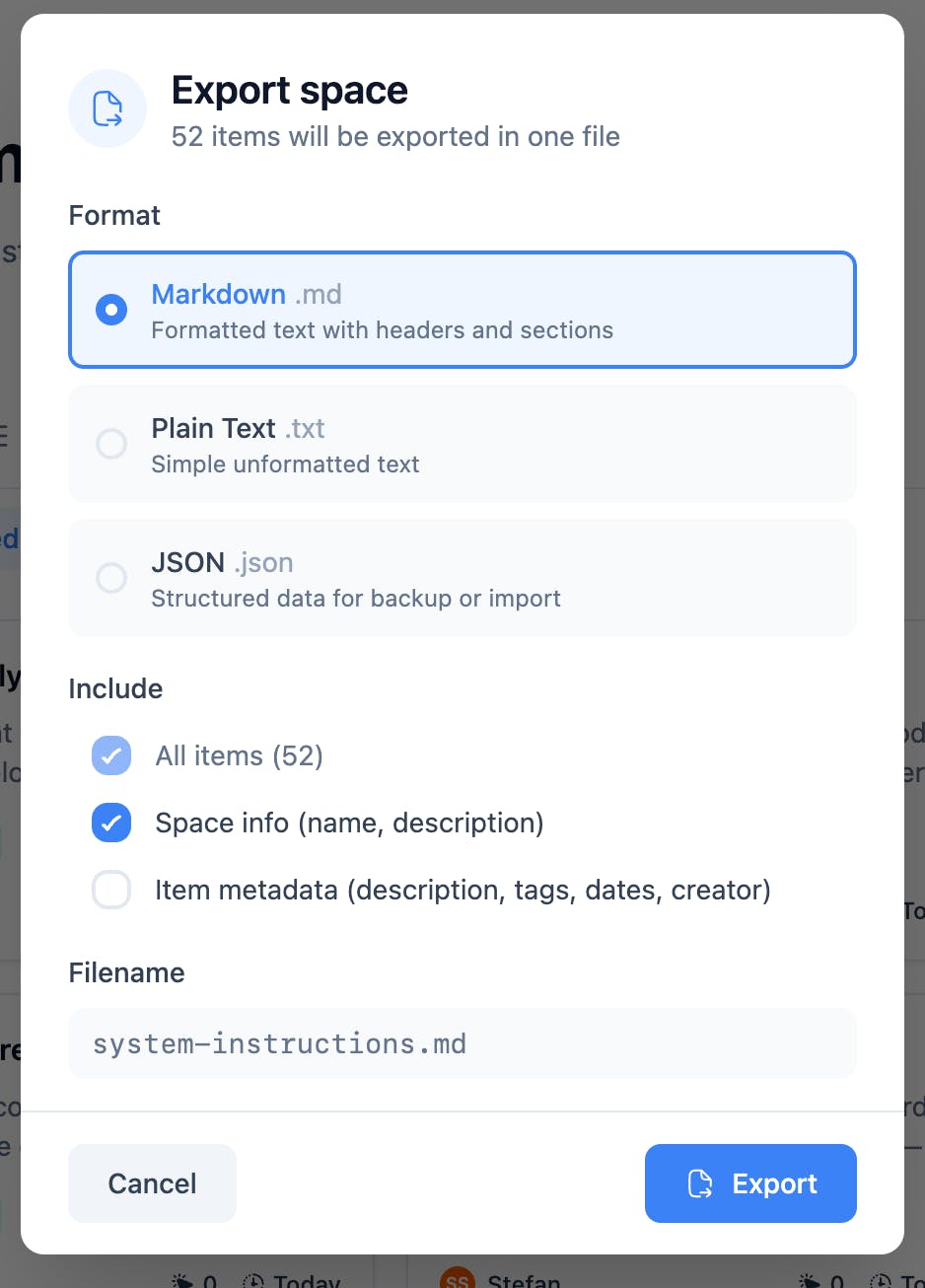 @bengeekly Grok is on our roadmap, for sure. And yes, you can export entire spaces or individual memories. the Export function is in the ... (more) menu in the top right and looks like this: