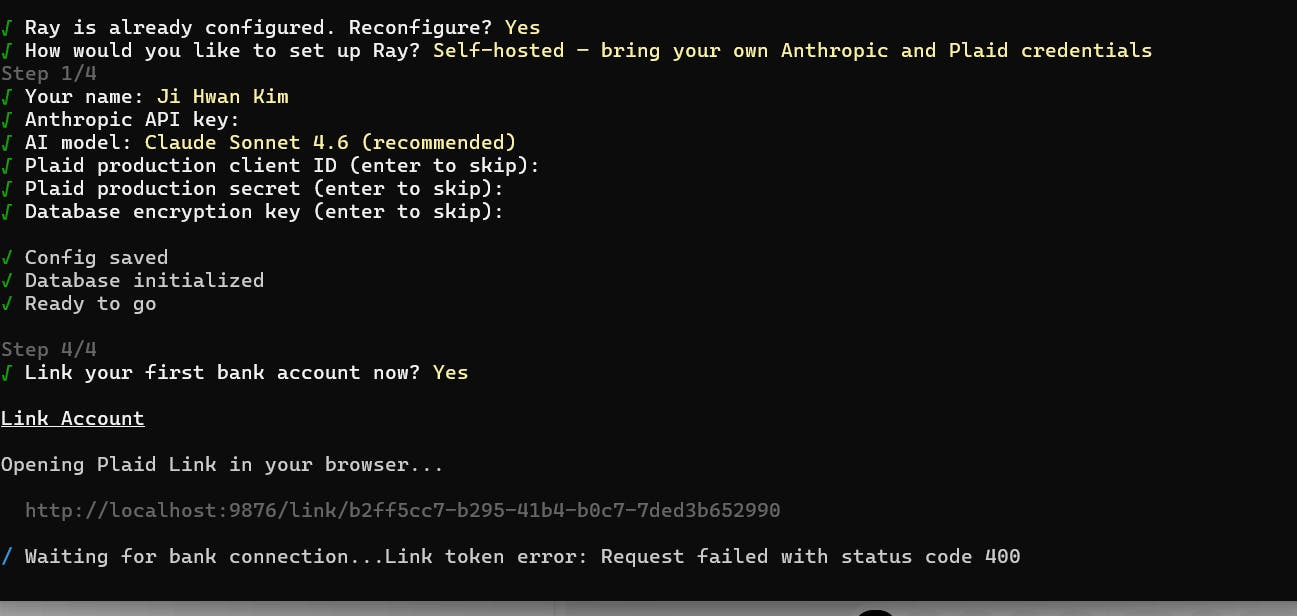 Type `ray` to start chatting with your money