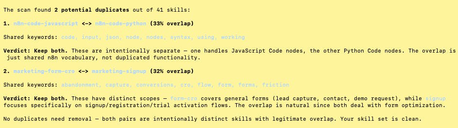 11% active rate sounds about right. I have a similar pile of skills I keep adding "just in case" and never trigger. The dedup feature is the real value here - I definitely have overlapping skills that quietly fight each other for context space. Going to run this today