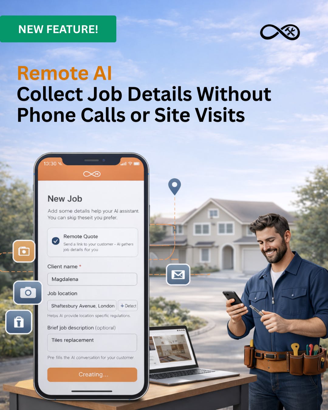 The AI asks the right questions, collects photos and job details, and sends everything straight into the app.
