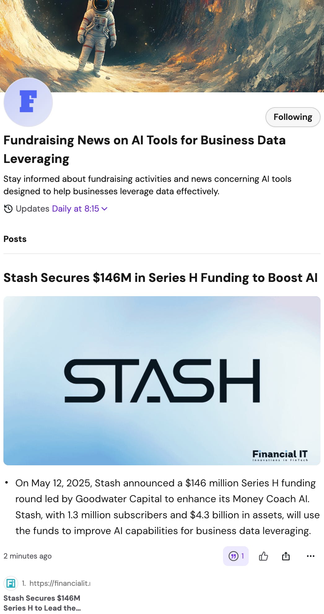 @supa_l Dear Supa! Thank you for the SUPA comment! I've checked out your page and see that you have launched Powerdrill before, seems to be AI tool that helps business leverage their data. Maybe you will be interested in fundraising news of similar tools of yours! THUS I've created a news channel where you can get automatic updates on what you care: