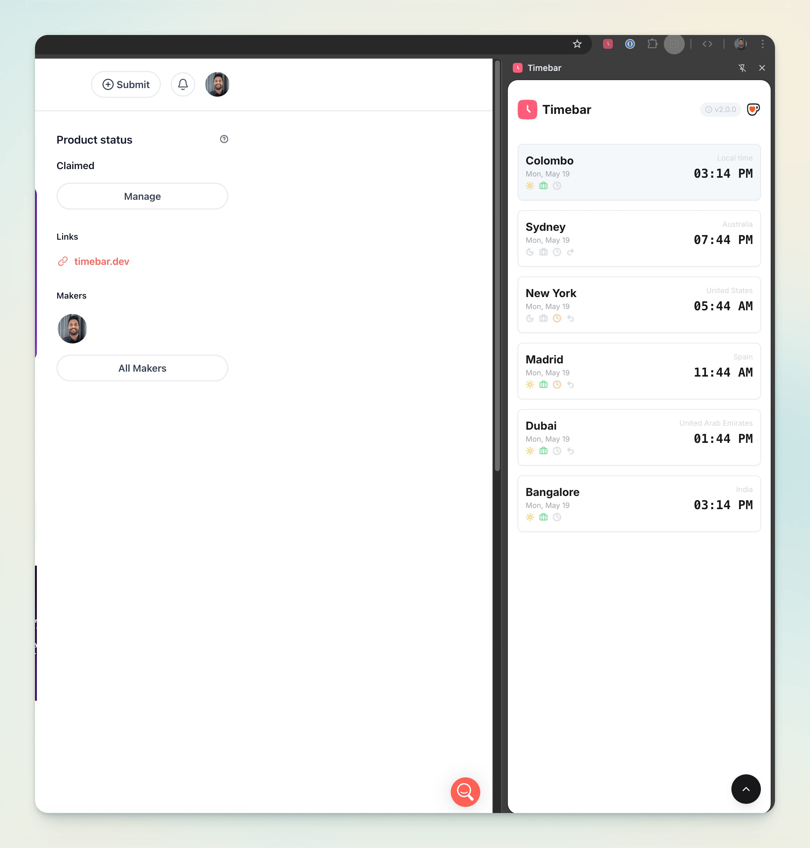 Timebar is a Chrome extension that makes it easy to track and manage multiple timezones right from your browser's sidebar. It helps remote teams, global clients, and international collaborations stay in sync without leaving their browser.