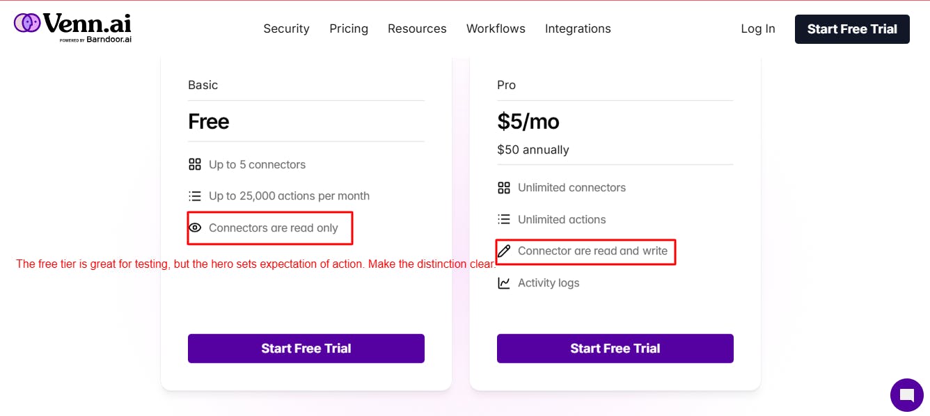 The confusion is around the hero section saying "set guardrails for what it can read and write." So a user lands, reads that, then sees the free tier is "read only" on the pricing page. They might think they need Pro to actually take action.