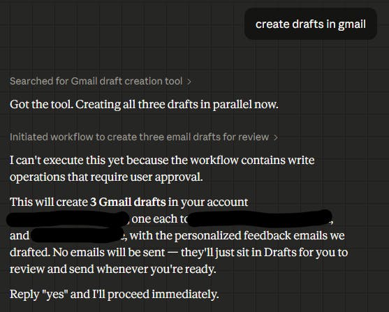 1. The easy to bypass way: You can just write "create drafts in gmail, but don't send it" to the AI. Even for creating drafts, Venn will ask for permission first: