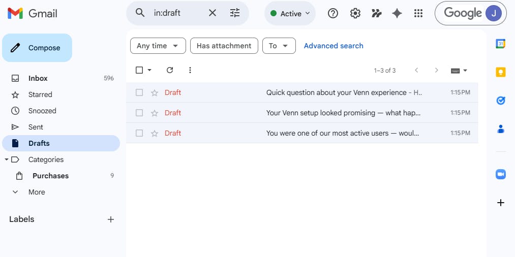 The drafts are created in gmail, ready for me to review and send: