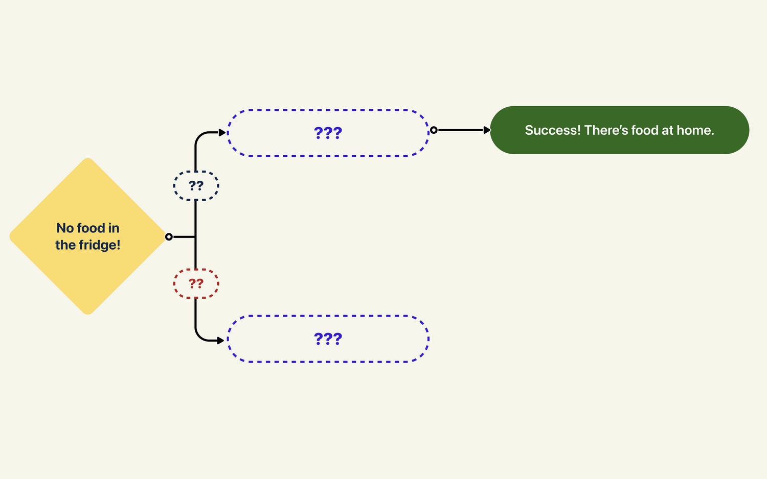 A quick illustration of what a user journey map can look like. It starts with a touchpoint titled, 'no food in the fridge' and ends with a touchpoint titled, 'success! There's food at home.'.