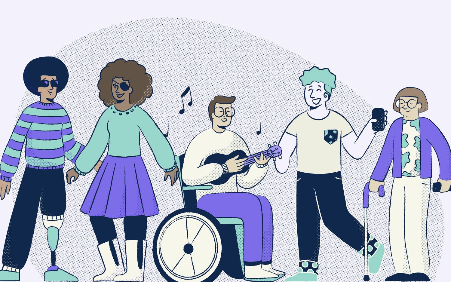 Illustration of a diverse group of individuals socializing including individuals with visible disabilities.