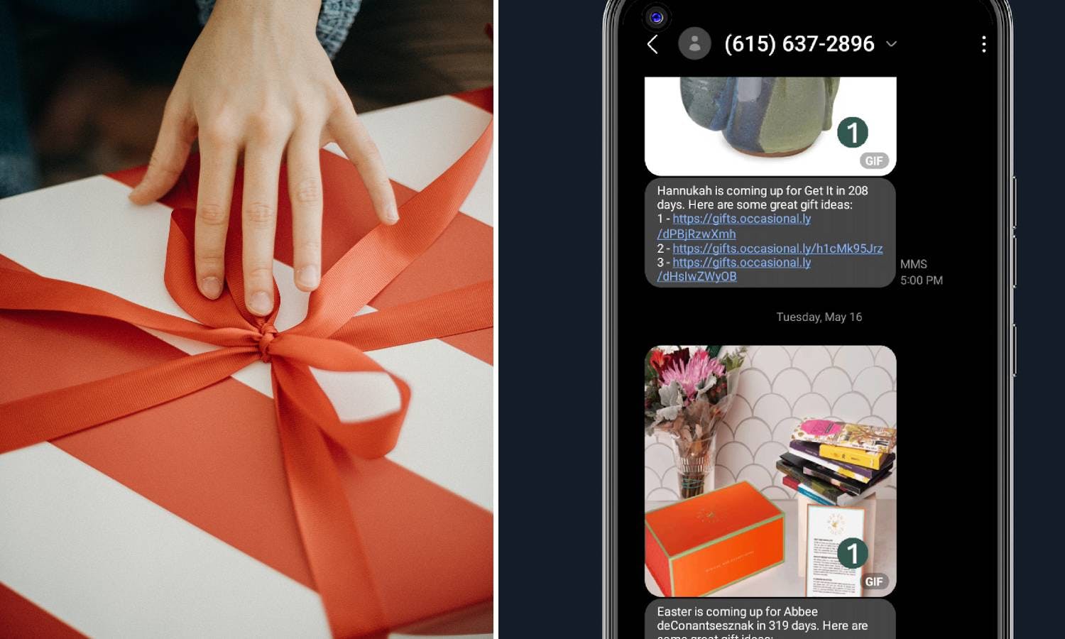 Users will then receive text message reminders that include product links and a dynamically-generated gif showcasing Occasional.ly’s top three gift ideas, which are sourced from small businesses.