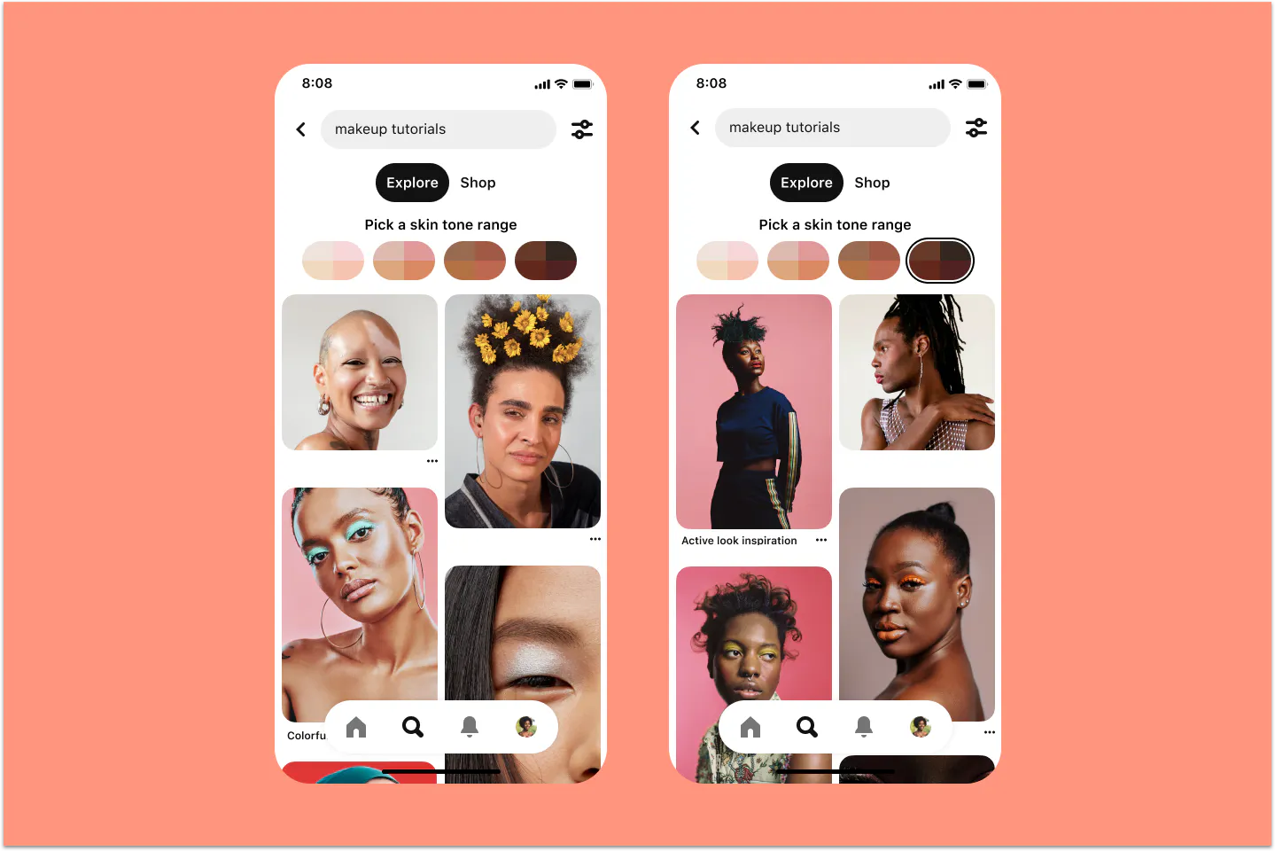 AT: One of the big things that we learned is people simply don't know our skin tone feature exists. The reason why is that it only exists on a limited number of product surfaces. To begin with, we turned on the feature for a small set of queries related to beauty searches. So as people use Pinterest to search for something like makeup our feature would appear. But if you're not searching for things like makeup, you may not know that it exists.