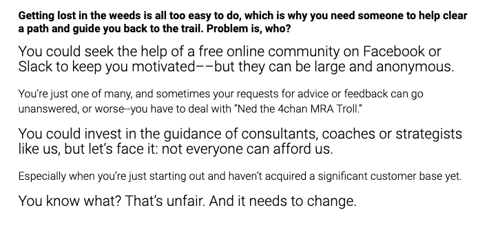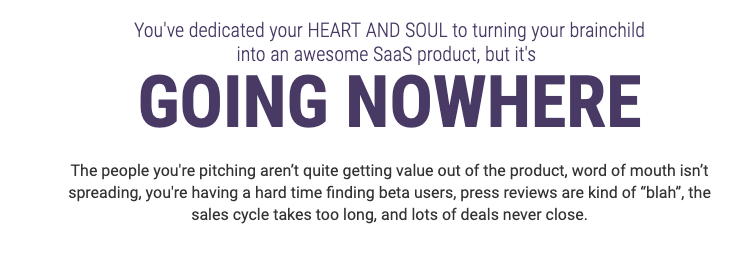 For example, on the sales page for a mastermind program for SaaS founders, I paint a picture of what it's like to struggle in the early days, before finding product-market fit: