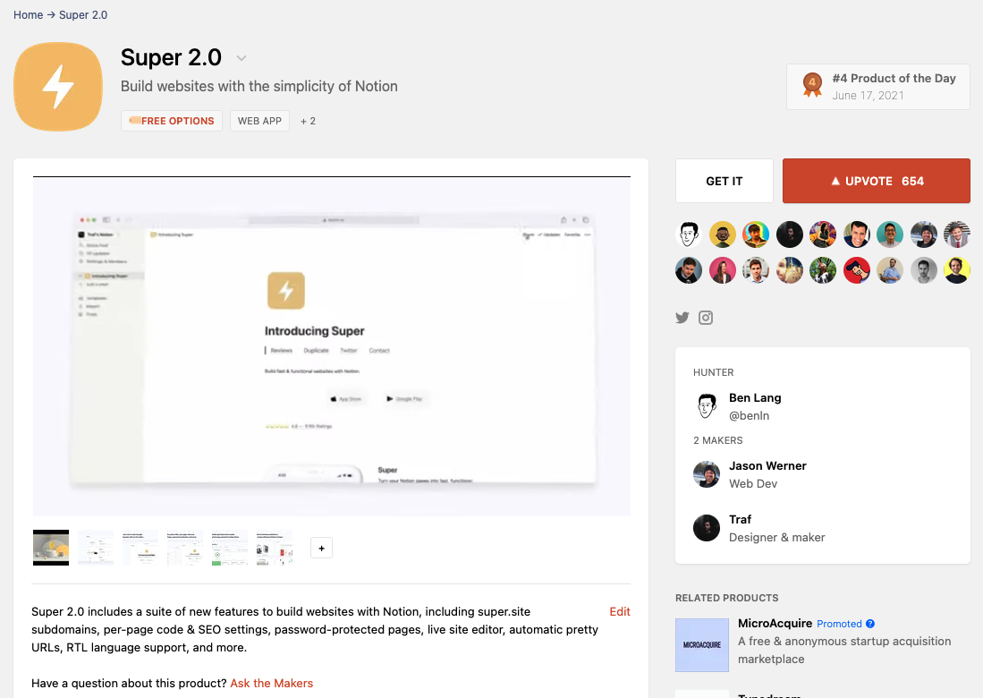 The Bulletproof Notion Workspace 2.0: This workspace setup garnered more than 500 upvotes when it launched. William Nutt's tagline for this project was "the intelligent framework for any Notion workspace,” a tagline that resonates with all users on Product Hunt. He also made sure to respond to every comment in the conversation. William understood his audience, knowing how to speak to them and the importance of community-building by responding to comments, which helped build excitement around his setup.