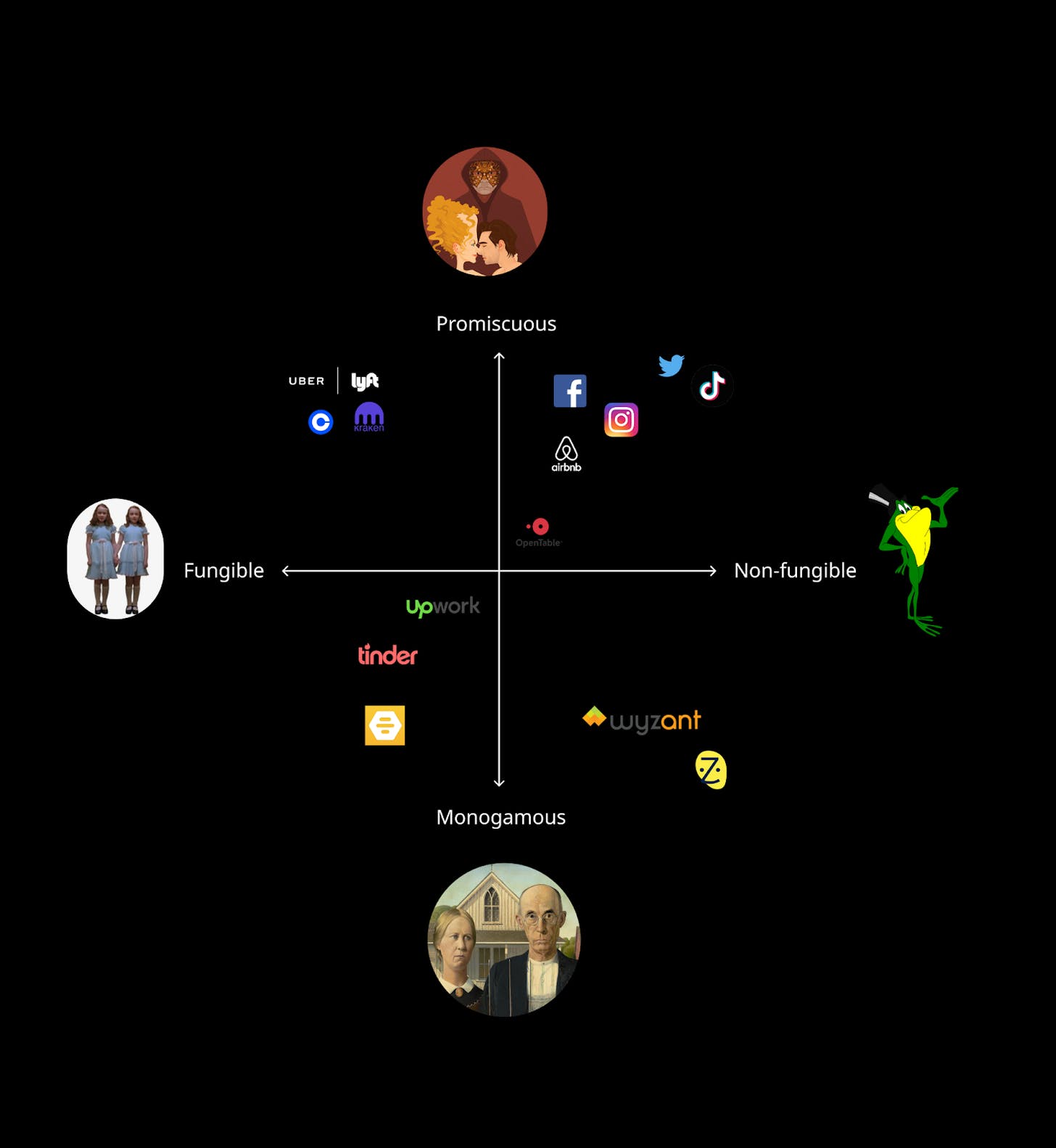 Non-fungible markets, however, create both the very best and the very worst companies, depending whether they’re promiscuous or monogamous. Monogamous, non-fungible marketplaces are terrible business propositions: users will find a specific option that they like and leave the platform to continue with that individual forever. Promiscuous, non-fungible marketplaces, however, are the best business propositions: users will need to continue returning to the platform both to fulfill their individual taste (non-fungibility) as well as to find more options that match their preferences as well (promiscuous). These are, in many ways, the greatest marketplaces.
