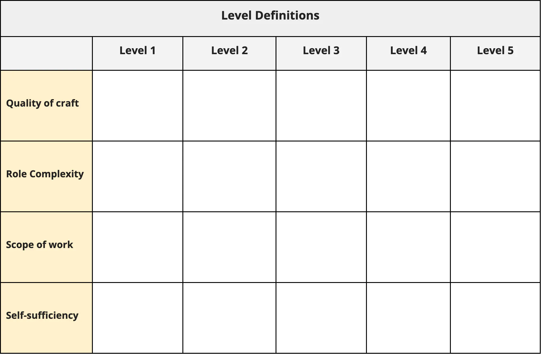 In this example, we’ve decided we will be defining our Levels based on increasing: quality of craft, role complexity, scope of work, and self-sufficiency.