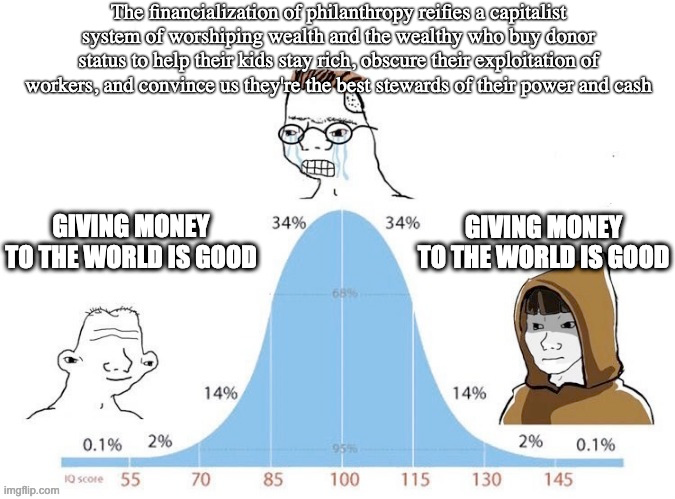You could argue, of course, that this is already happening and is not such a great thing. Money donated is inevitably a proxy for money earned, one that validates the ultra-wealthy as good people, no matter how they’ve made their money (witness mega-philanthropists like Jeffrey Epstein and the Sacklers family). You could go further and say most philanthropic giving is anything but: donations to Ivy League schools to help secure the admission of your heirs is not exactly redistributing wealth to those who need it, nor is giving money to private corporations whose stock you hold necessarily a model for creating a less inequitable world.