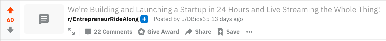 Drew made a post to the /r/EntrepreneurRideAlong subreddit. He got a ton of traffic to his separate stream from this. His post ended up being the top for the day and got 60 upvotes.
