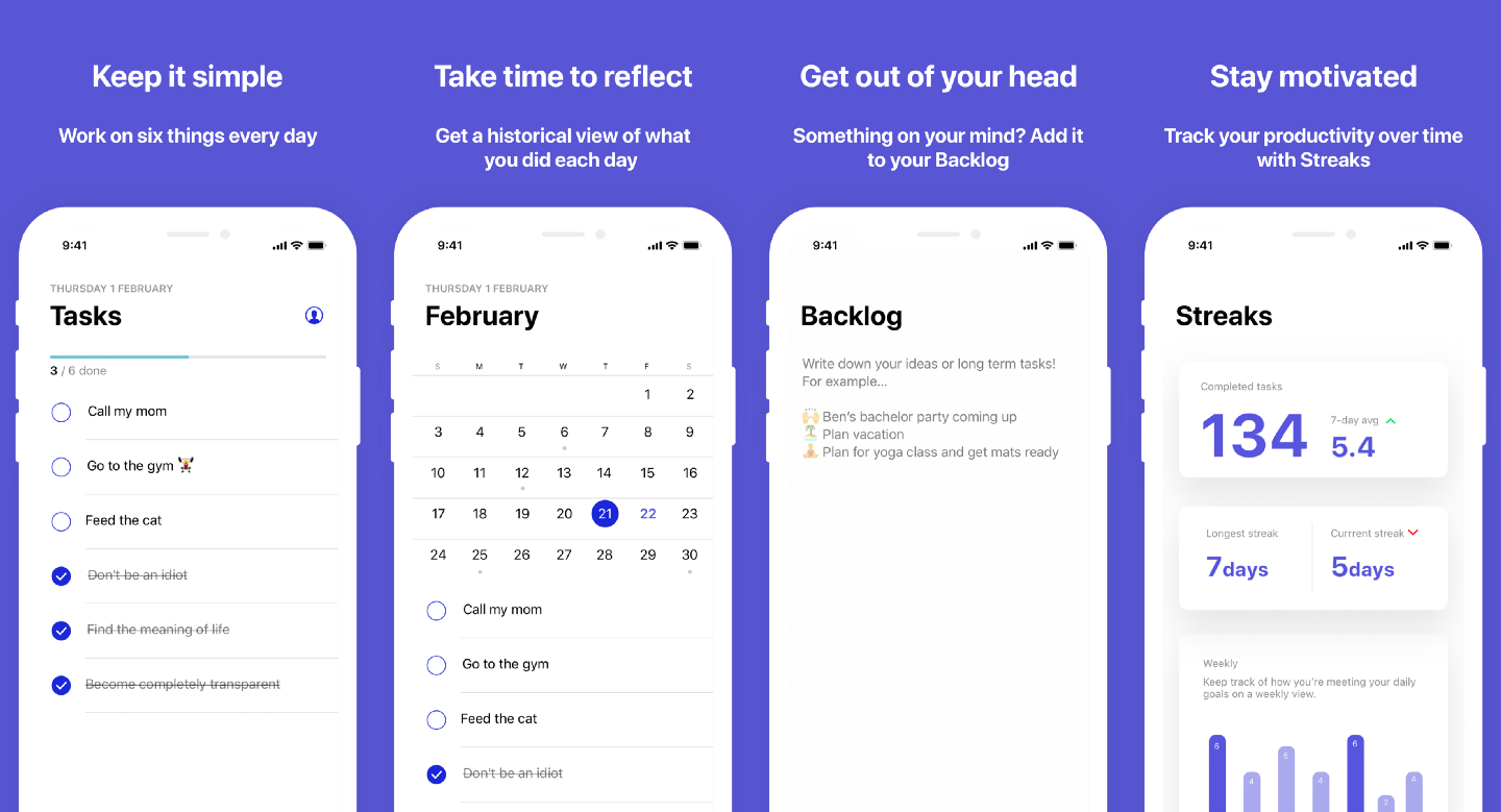 Keep it simple. Focus on just six things every day. No more, no less. If you don’t mark one item as complete by the end of the day, it’ll get moved to your list of to-dos the following day.
